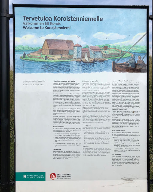 Tässä ristin alla on kirkon perustukset. Kahden muunkin rakennuksen perustuksia alueella on näkyvissä. Koroistenniemellä on myös ollut hautoja, niitä on löydetty 330. Kirkon alta löydettiin kolme muurattua hautaa, jotka kuuluivat piispoille Bero I, Ragvald ja Catillus.