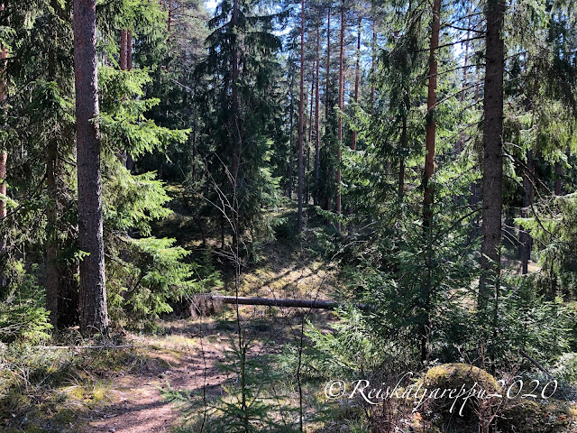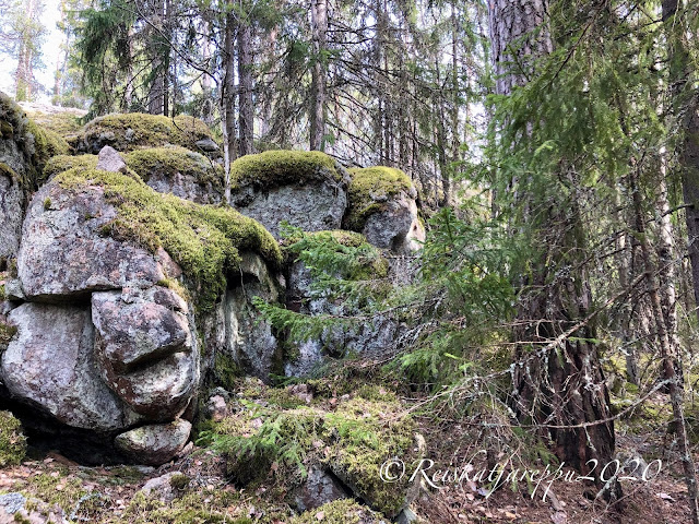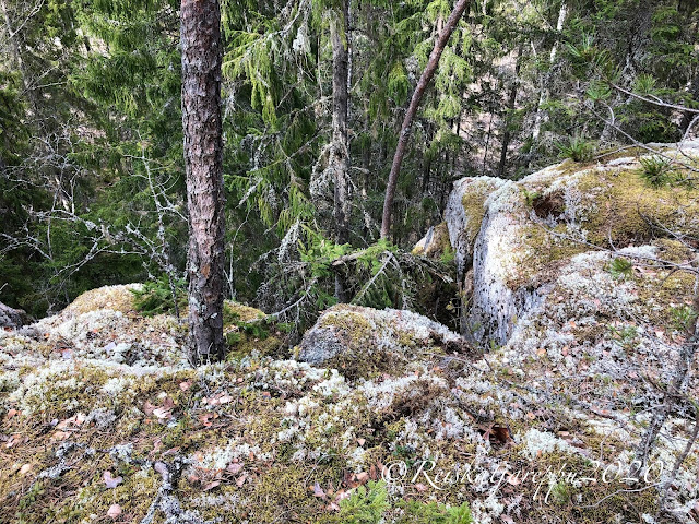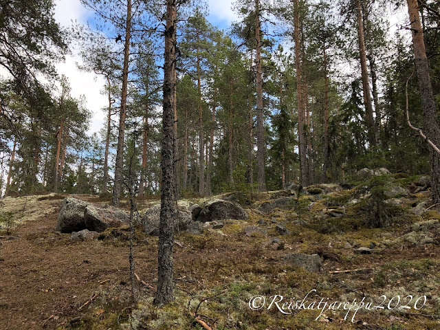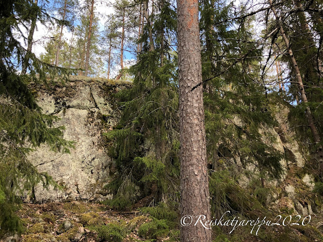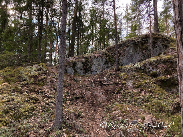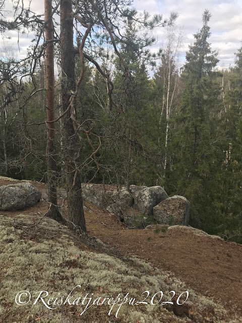 Tässä näkyy tasaista lakea kallion päällä. Siellä olisi ollut kivijättiläinen ja kiva aukko kalliossa, mutta emme niitä huomanneet, ennen kuin jälkeenpäin niistä luimme. Kiva kohde sisänsä ja suhteellisen helppo kulkea.