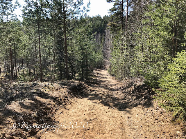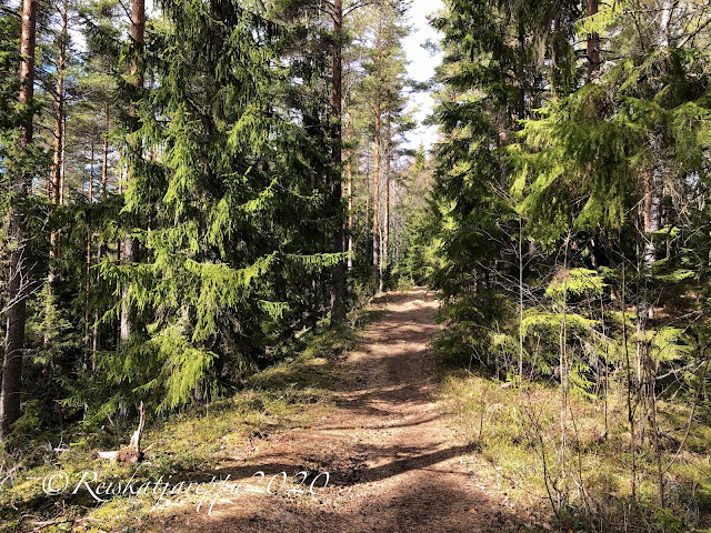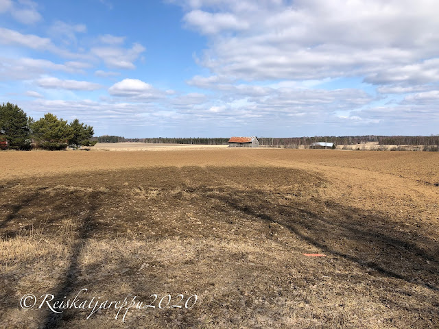 Autoille oli viitoitettu opaste, mutta jätimme auton siihen, missä muidenkin autot olivat. Kävelimme kohti hevostalleja ja käännyimme oikealle hiekkaista tietä pitkin. Ei olisi ollut mitään mahdollisuutta ajaa autolla tällä keväisen, märällä tiellä. Se oli niin pehmeää ja isot urat olivat tiellä.