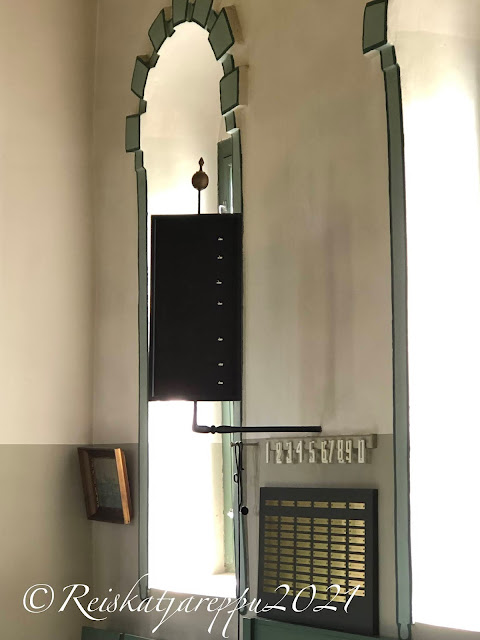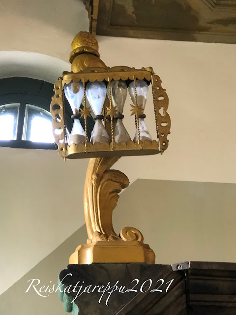 Saarnastuolissa on neljän tiimalasin kokonaisuus. Suomessa se on melko harvinainen. mutta Keski-Euroopassa yleinen katolisissa kirkoissa. Olemme muutamissa kirkoissa näitä nähneet, mutta tarkoitus ei ole oikein selvä. Saarnojen pituus, kenties? Tiimalasi lienee tullut myös päärakennuksen kirkkosalista.
