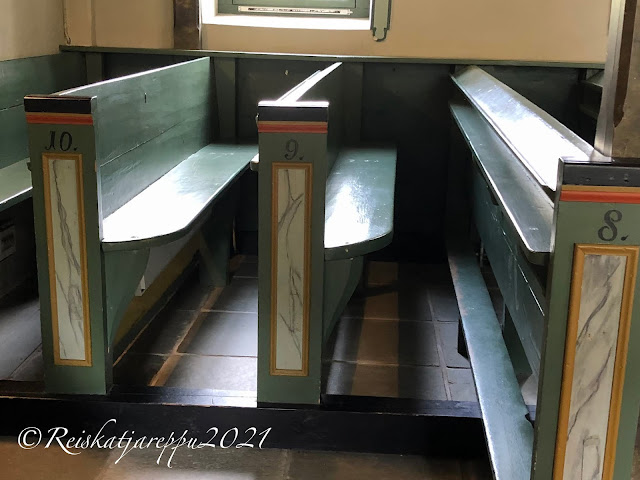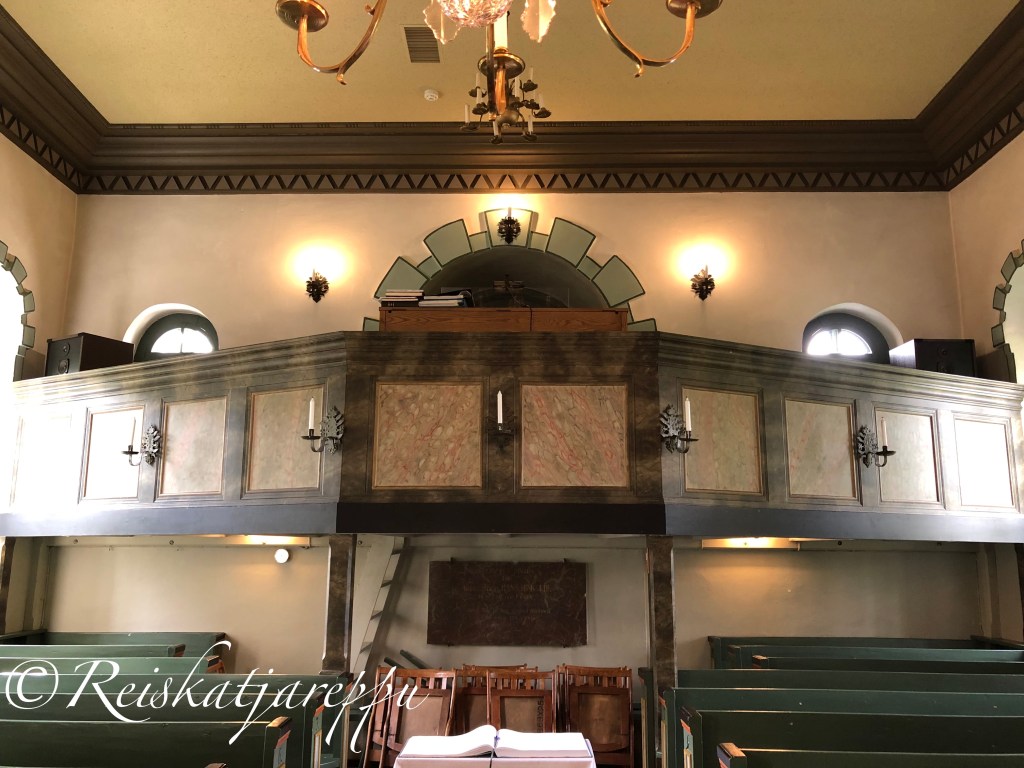 Ovi oli kutsuvasti auki ja vanhempi ystävällinen herrasmies toimi kirkko-oppaana. Hän kertoili kirkon historiasta ja nykypäivästä. Kirkko on pieni sisätiloiltaan ja sisään mennään pitkältä sivulta. Kirkkoon mahtuu noin sata henkilöä. Toisessa päässä on alttari saarnastuoleineen ja toisessa päässä on matala urkuparvi. Just mahduin seisomaan sen alla.