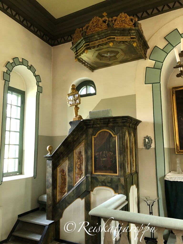 Saarnastuoli on peräisin vuonna 1770 valmistuneen kivikartanon kirkkosalista ja se on marmoroitu 1700-luvun lopun muotivärein vihreäksi ja harmaaksi. Saarnastuolin yläosassa kasviaiheinen koristeltu katos, jossa on hopeitu kyyhkynen Pyhän Hengen vertauskuvana. (tekstit kirkon esitteestä).