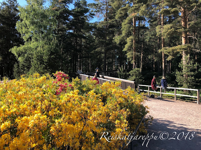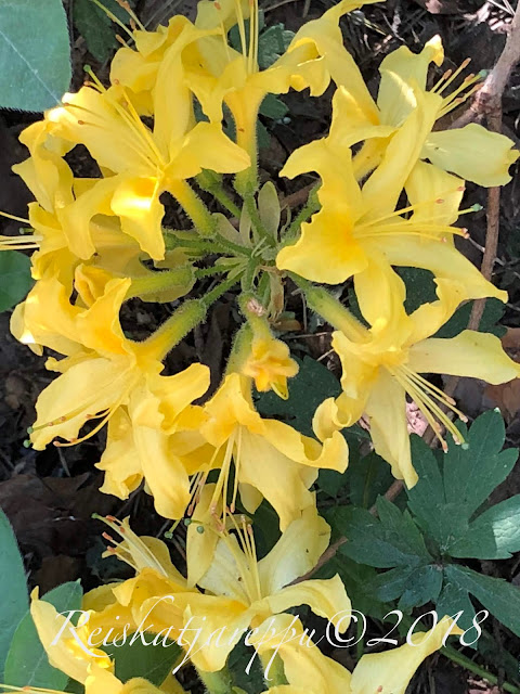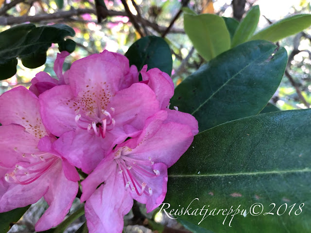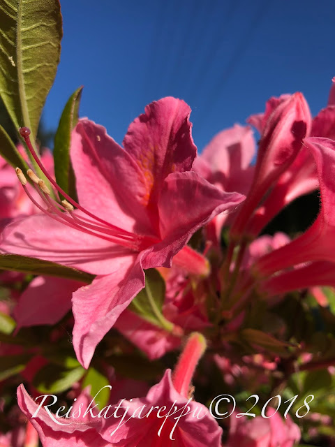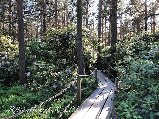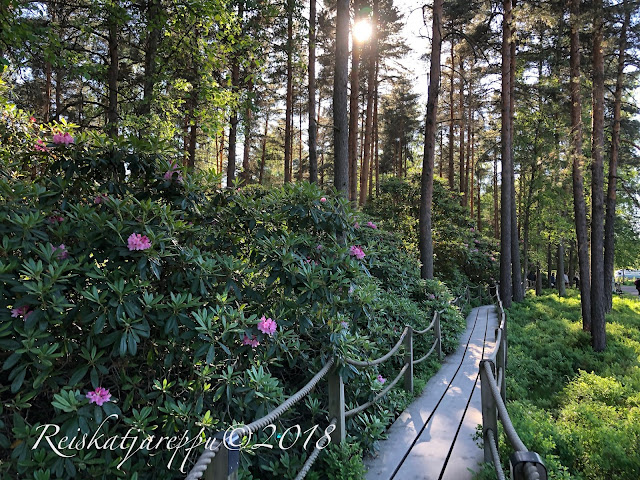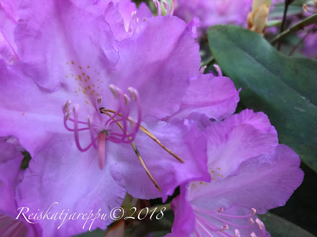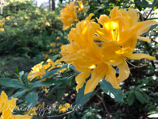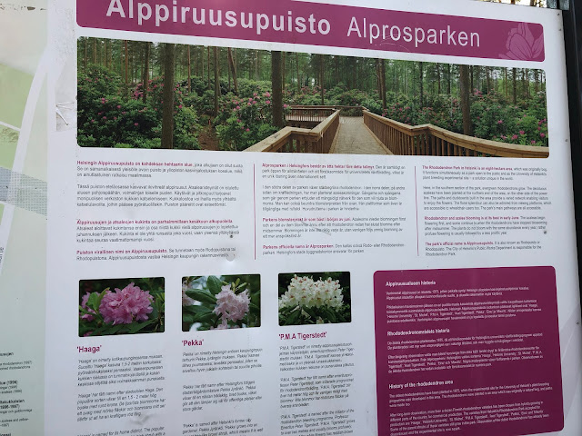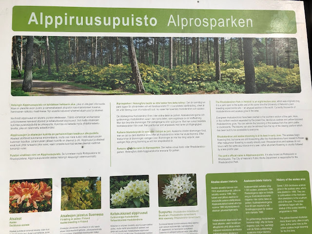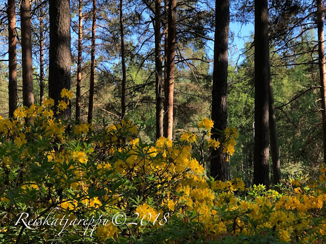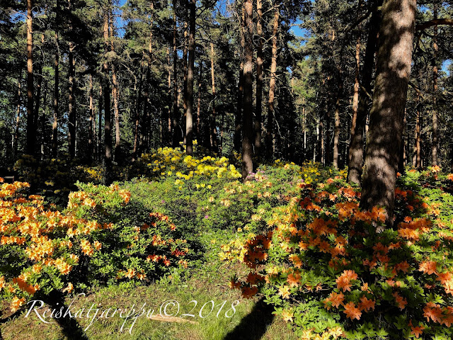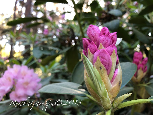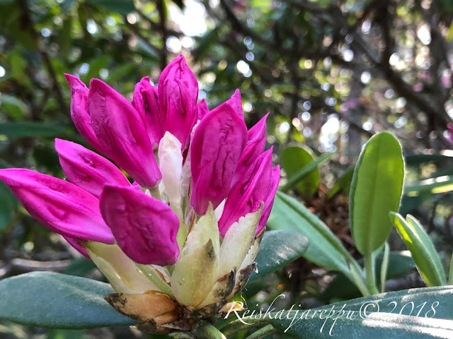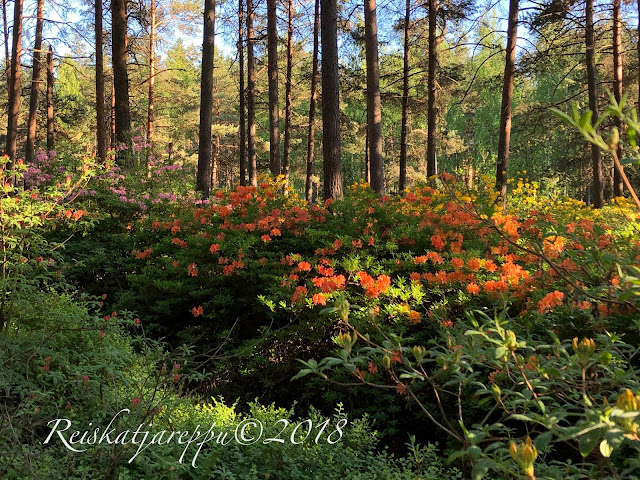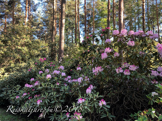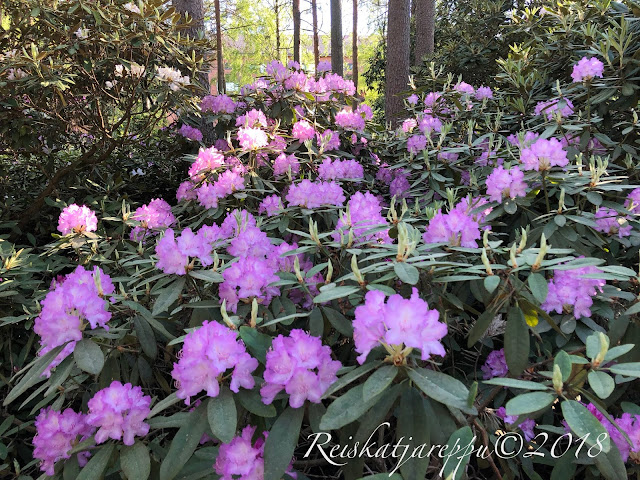 Kiehtovan kaunista kukintaa Alppiruusupuistossa Etelä-Haagassa Helsingissä. Meidänkin oli riennettävä katsomaan tämä lumoava alppiruusupuisto. Facebookin sivuilta vähän kyttäsin milloin puistossa kukinta alkaisi, että pääsisimme Krissen kanssa kukkia katsastamaan.