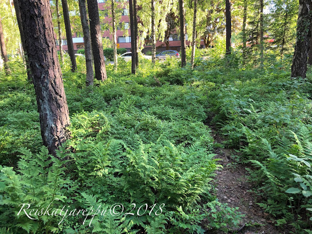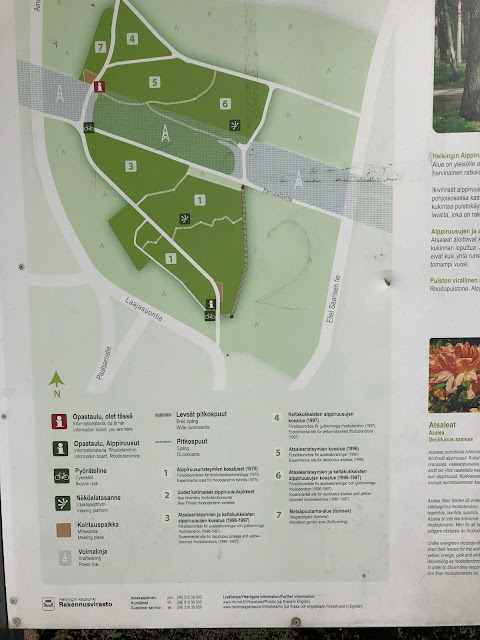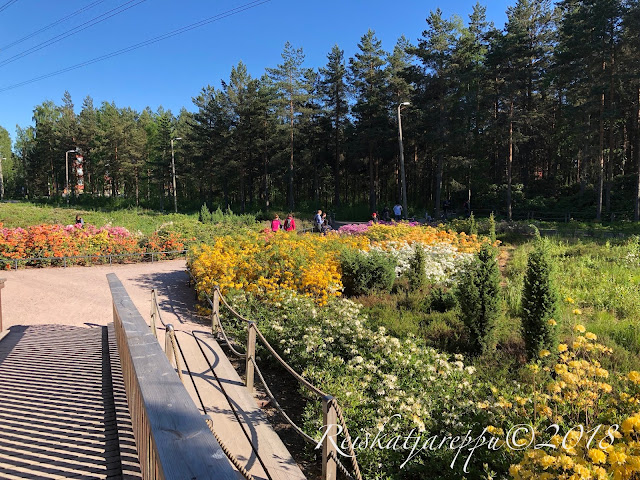 Puistoon oli helppo mennä, vaikka jostain olin lukenut, että puistoon olisi vaikea löytää, mutta väitän muuta. Auton sai hyvin parkkiin, kun Aino Acteen tie jatkui Paatsamantienä, joten siihen kadun viereen saimme pysäköityä, josta oli lyhyt matka kävellä sisälle puistoon. Kukkaloisto näkyi jo tielle ajaessamme siitä ohi.