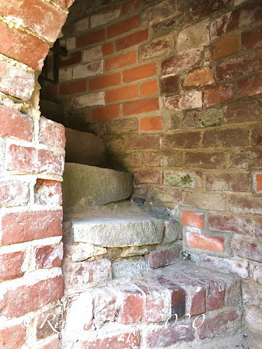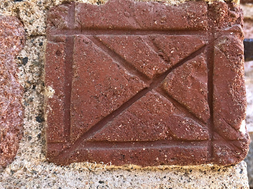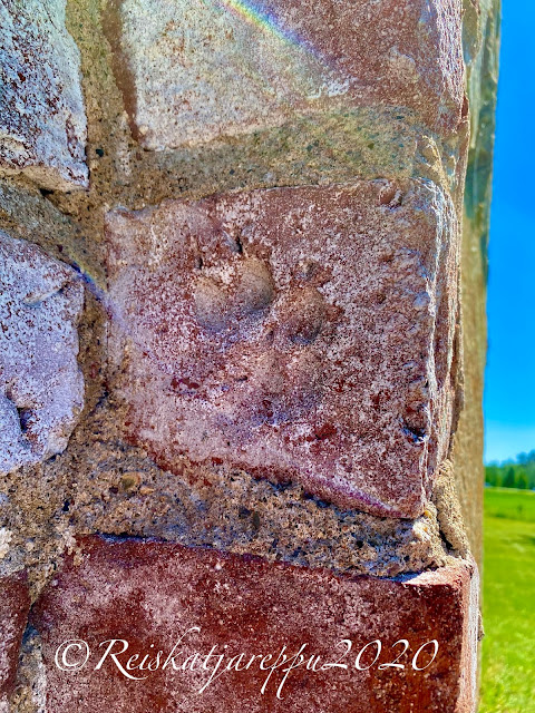 Pääoven vieressä olevassa kivessä on koirantassunjälki. Näkyy kuvassa ehkä heikosti. Todennäköisesti jälki on tullut tiilien kuivumisvaiheessa, kun koira on kävellyt tiilien päällä.