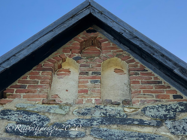 Ensimmäisenä kiinnitti huomiota päädyn kauniit koristeet. Ylimpänä on upea vinotiilikoristelu. Sen alla Apostoli Andreaksen vinoristi. Suuremmassa ”laatikossa” on kaksi ympyräkuviota ja oikeanpuoleisen ympyrän keskellä ihmisfiguuri. Laatikkoa ympäröi kalanruotokuvio. Keskiaikaisia taidonnäytteitä.