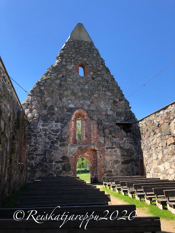 Rauniokirkon penkit kielivät olevassa olemasta toiminnasta. Täällä vietetään vielä häitä, jumalan-palveluksia, konsertteja ja muita perhejuhlia. Voiko kauniimpaa paikkaa olla selkeän sään vallitessa viettää täällä mainittuja tapahtumia.