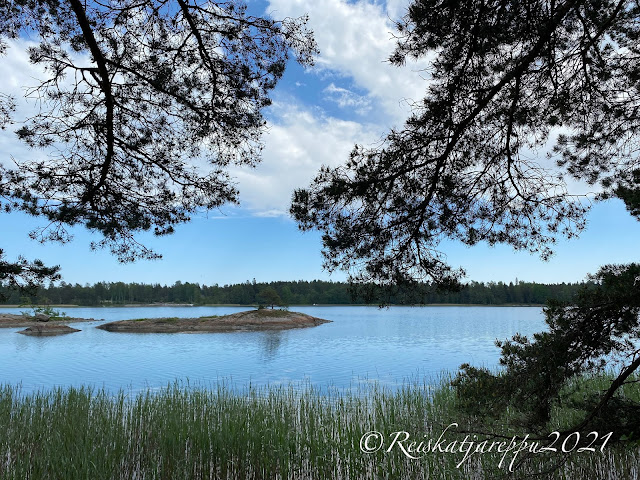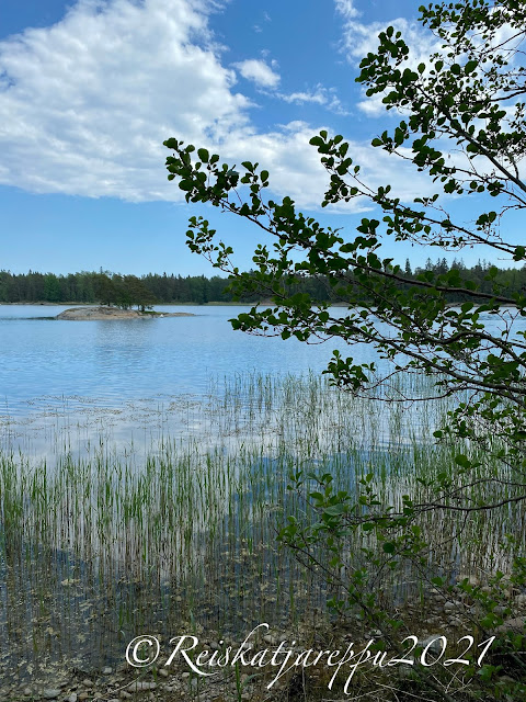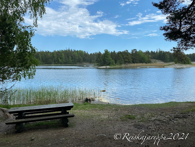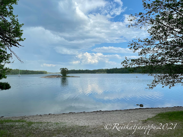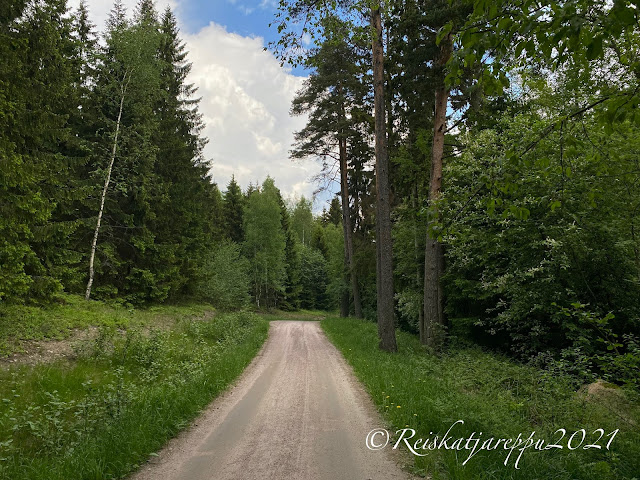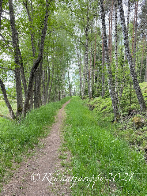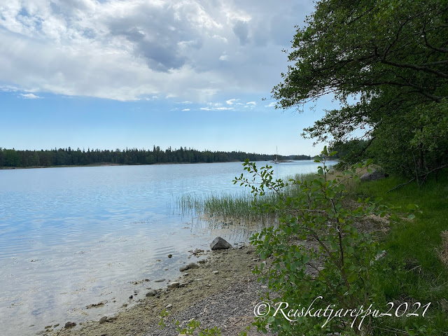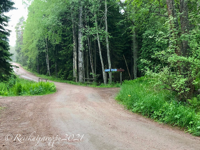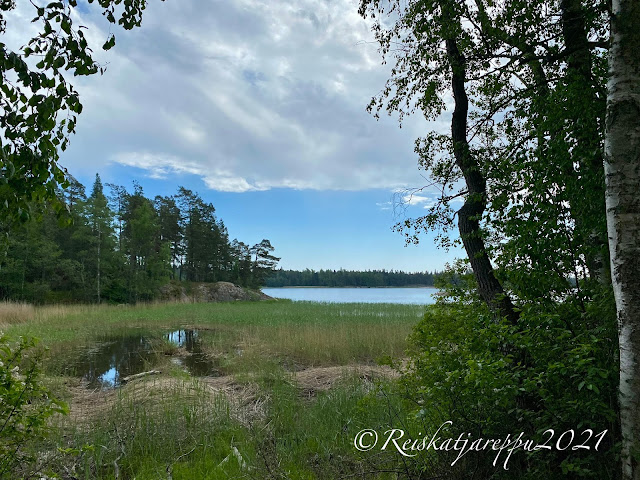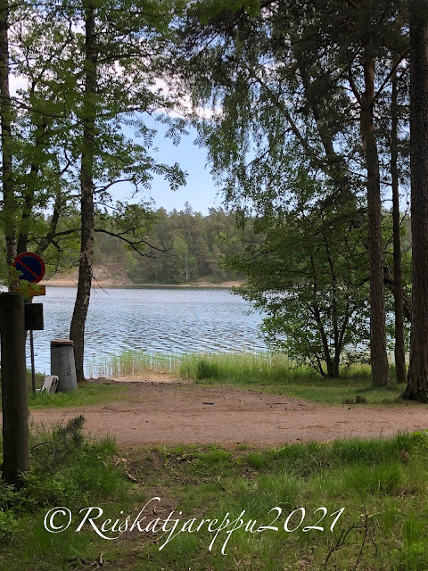 Lämmintä, kesäisen lämmintä, mutta sää alkoi muuttumaan pilviseksi saapuessamme Väransbyn ulkoilualueelle Jorvakseen. Tämä ulkoilualue on ollut liian lähellä pääkaupunkiseutua, ettemme olleet aiemmin täällä käyneet. Väransbyn ulkoilu- ja teltta-alue kuuluu Espooseen, vaikka sijaitsee Hirsalassa Kirkkonummella. Hirsalantie on mukavaa ajella ja katsella mukavia maalaismaisemia, ainakin apukuskin on kiva katsella. Hirsalantie muuttuu Ankarlaxintieksi, joten sitten ajellaan hiekkatietä niin pitkälle, että tulee P-paikat ja portti. Me jätimme auton parkkiin, tutkimme alueen karttaa ja lähdimme tepastelemaan tietä pitkin. Vasemmalle jäi matkailuvaunualue, joka on yksityisaluetta, joten ei kande sinne poiketa.
