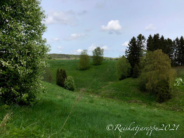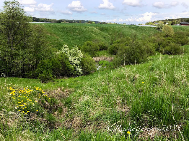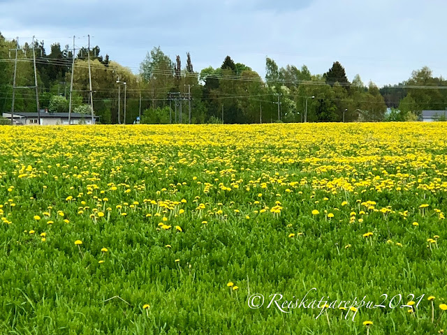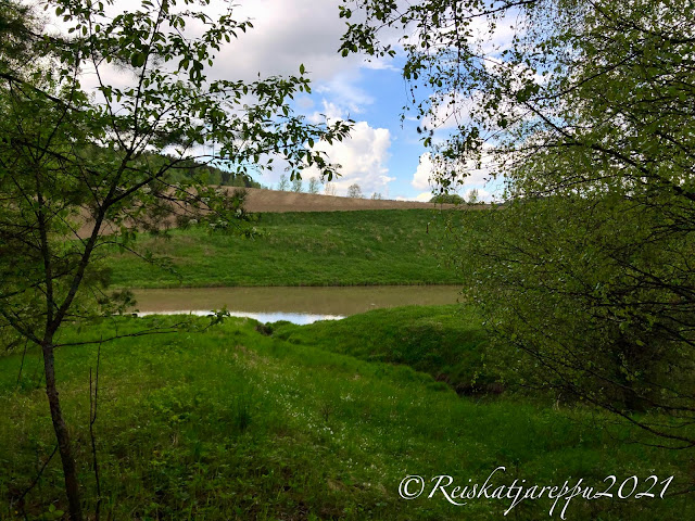 Tuumasimme, ettemme enää tänne saavu, ehkä joku toinen voi käydä katsomassa luontopolun kokonaisuudessaan. Emme nähneet viittoja tai muutakaan vastaavaa, eli ihan summassa kävelimme. Jälkeenpäin vielä karttaa katsoessa meidän olis pitänyt kävellä joen vierustaa eteenpäin, mutta saappaat olisivat silloin olleet tarpeeseen. Meillä ei ollut kokemusta vesiesteiden loikkimisesta. Tuoksut olivat huumaavat tuomista ja ilma oli täynnä lintujen liverrystä, niin mikäpä meillä oli kävellä voikukkapellon reunaa. Vain me kaksi.