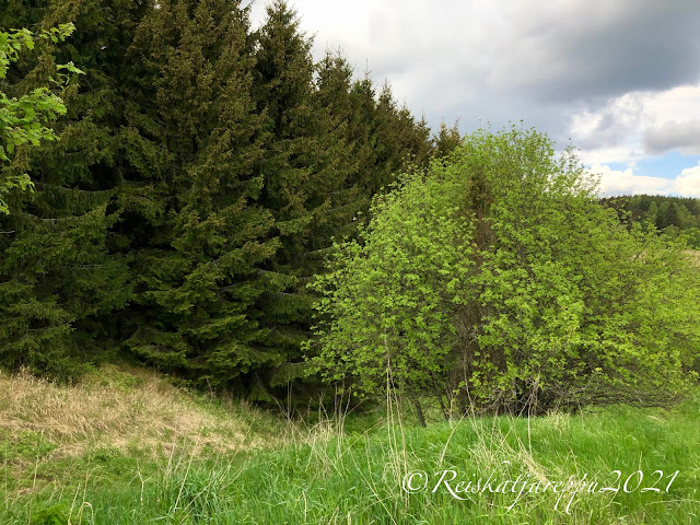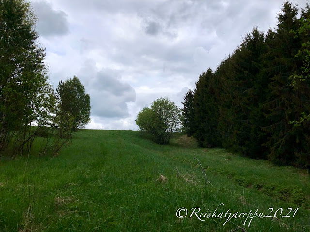 Mutkittelimme pellon reunaa ja saavuimme kuusikon kohdalla. Kävelimme sen reunaa jonkun matkaan, etsiessämme meneekö kuusikon läpi polku. Ei nähty, oli niin läpi pääsemätön, ettei edes yritetty. Tultiin takaisin ja laskeuduttiin tuosta alemmasta kuvasta näkyvästä mäestä.