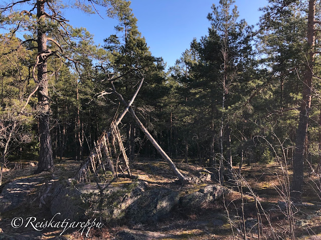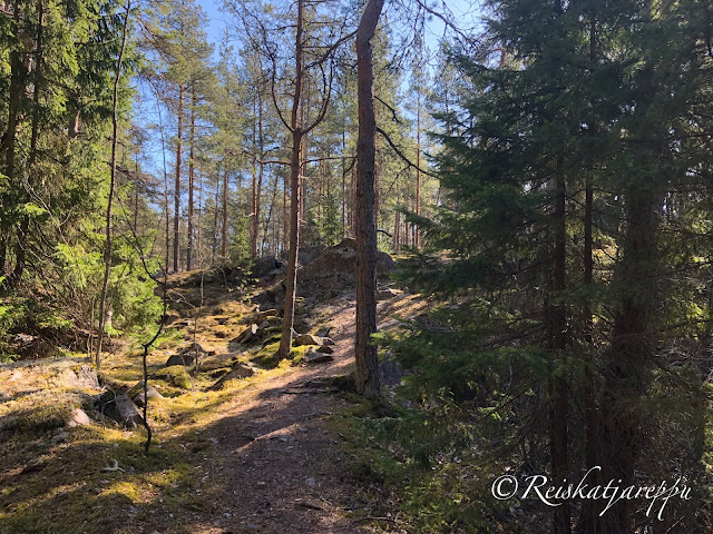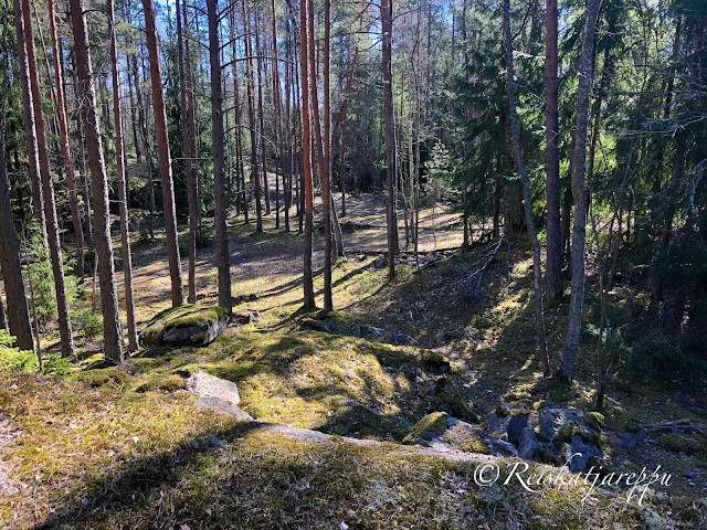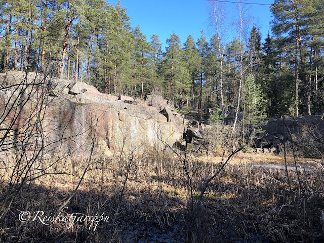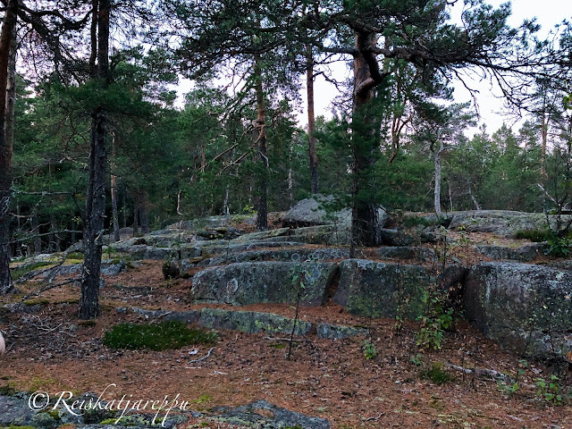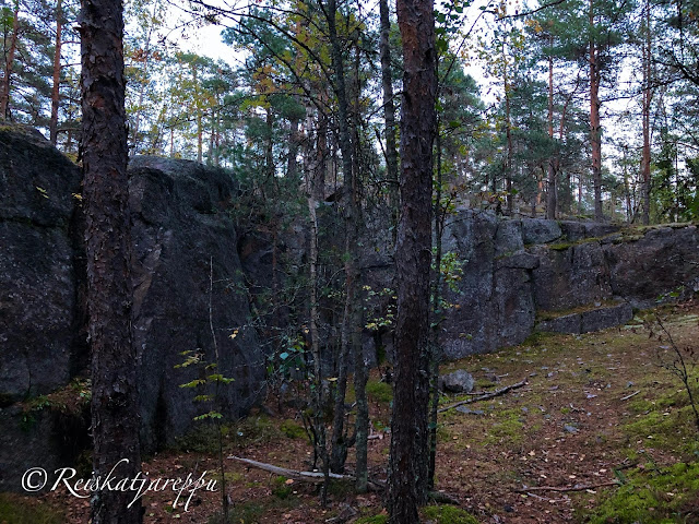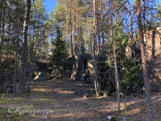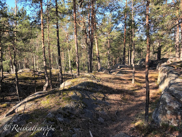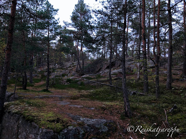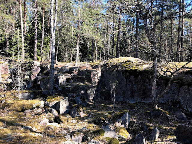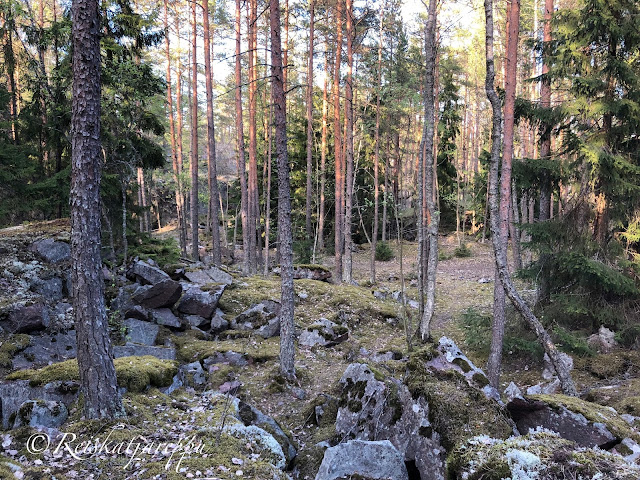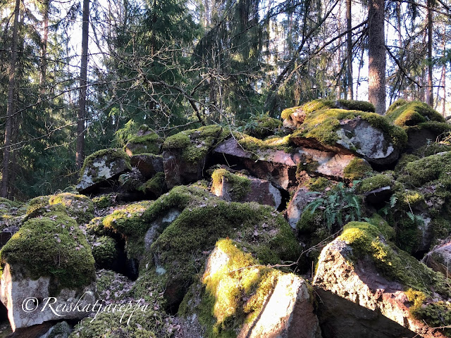 Villa Elfvikin luontotalolle ja luontopolulle mentäessä voi poiketa metsään muutamasta kohdasta. Metsän näkymä riippuu siitä, mistä metsään poikkeaa. Tulee väkisten mieleen sanat, kun metsään haluat mennä nyt, sä takuulla yllätyt. Niin mekin yllätyimme, kun ensimmäisen kerran astuimme metsän kätköihin. Olemme Krissen kanssa käyneet täällä jo useamman kerran, joten kuvat ovat useammalta käynniltä, syksyltä ja keväältä, päivältä ja auringonlaskiessa. Siellä tulee yllättäen vastaan kivikasoja ja louhittuja kallioita. Kuin astuisi salaiseen puutarhaan.
