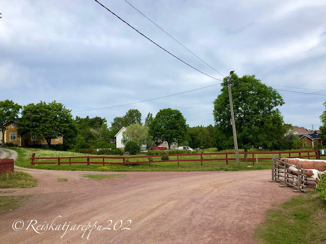 Rantaan saavuttuamme se oli täynnä veneitä, suuria ja pieniä, moottoreilla ja mastoilla varustettuja. Viehättävä kylätie johdatti meitä kylän keskustaan. Ihania pihoja, aitoineen, pensaineen, ruusuinen. Kävimme Farmors Café pihalla. Olisimme ostaneet juotavaa ja jäätelöä, mutta turistipaljous ja jonon hitaus sai meidät vaan jatkamaan matkaan.