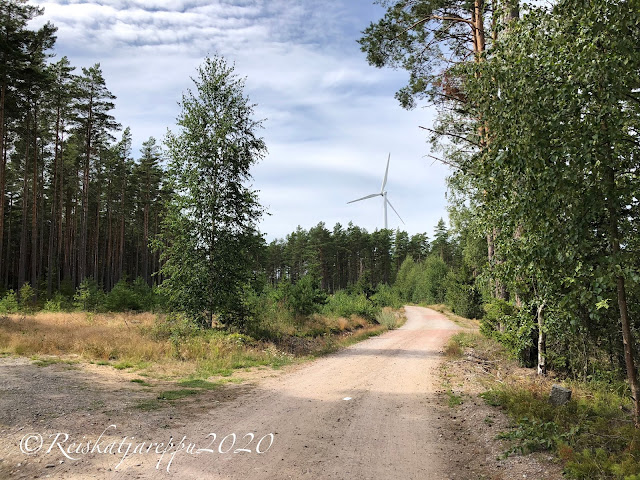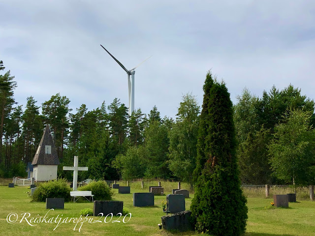 Hautausmaan vierellä kohtasimme nykyaikaa. Valkokylkiset, valtavat siivet kohoavat puiden latvojen yläpuolelle, kolmoset, työhevosten mukaan nimetyt, kyläisten yhdessä rakentamat tuulimyllyt Frejn, Ilon ja Floran. Ne on rakennettu 2007.