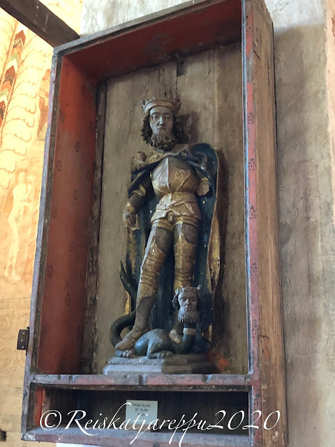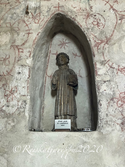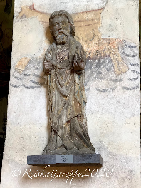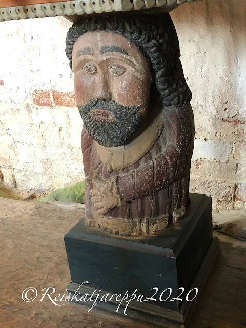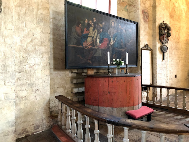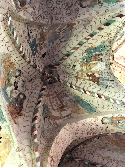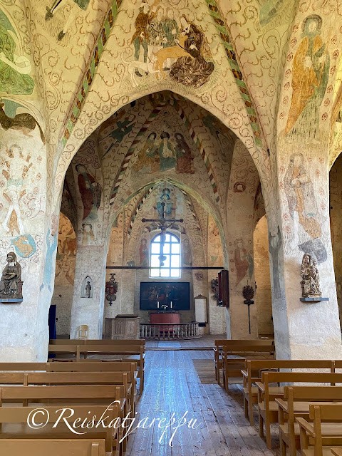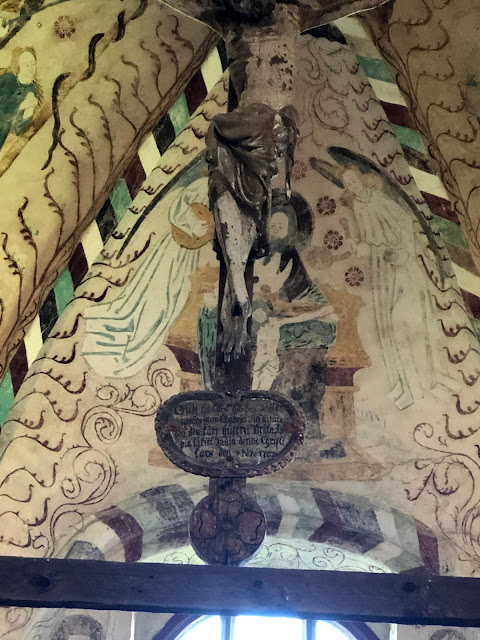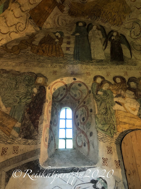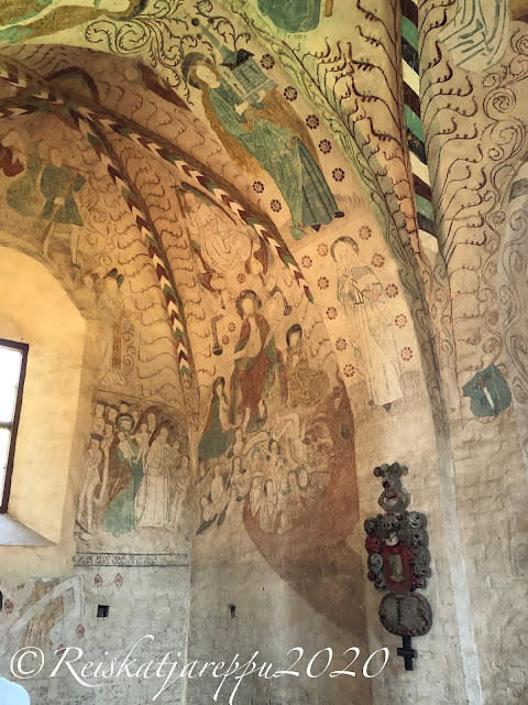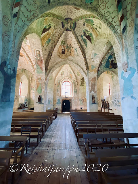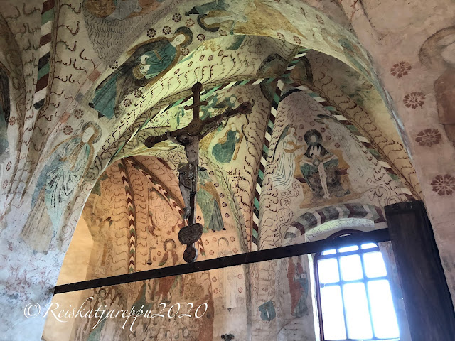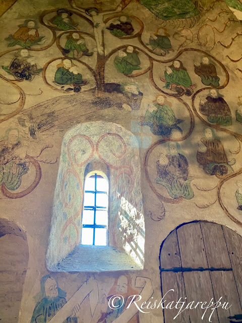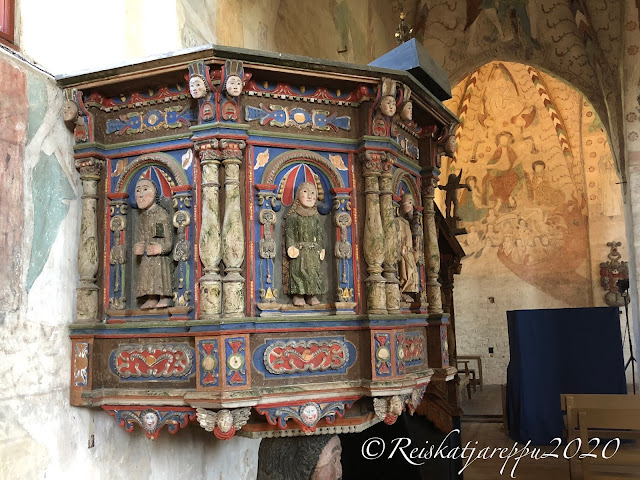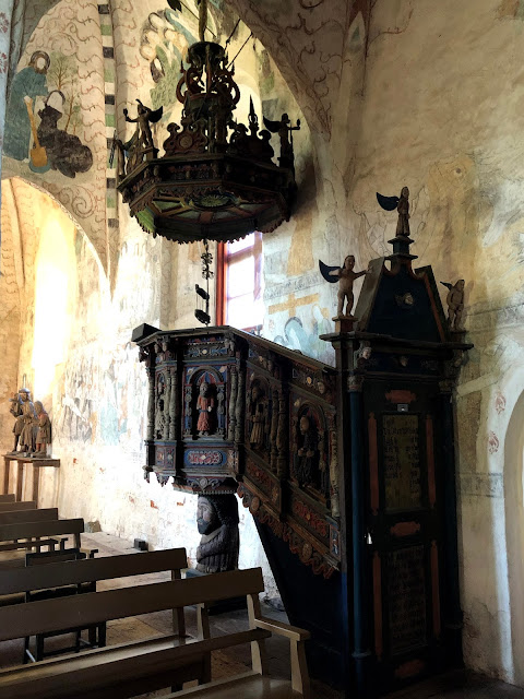Kirkkosaliin astuminen sai hengen haukkomaan ja veti mielen hiljaiseksi. Mykistyminen johtui tästä kauniista näystä, joka oli suorastaan lumoava. Seinät täynnä koristemaalauksia, pää pyöri kuin hyrrä, ei oikein tiennyt minne katselisi. Puuveistoksia. Upea saarnastuoli ja toinenkin. Huh! Monessa keskiaikaisessa kirkossa olemme onneksi päässeet käymään sisällä ja silti jokainen näistä on ainutlaatuisensa. Mutta tämä on yksi häikäisemmistä. Ulkokuori ei koskaan kerro sitä, mitä sisältä voi löytyä.