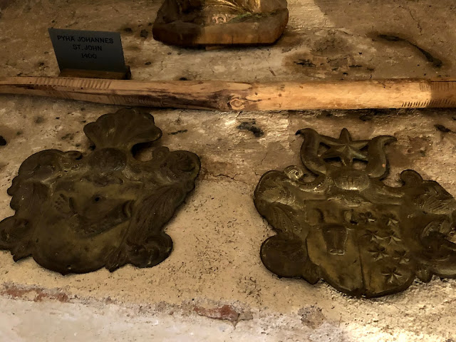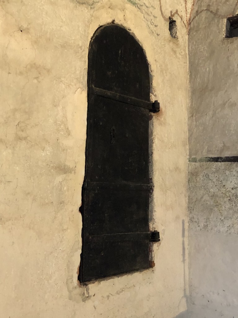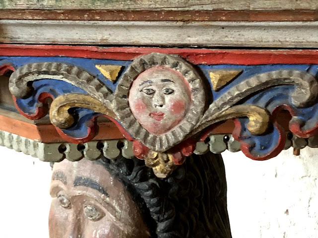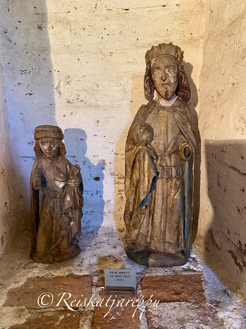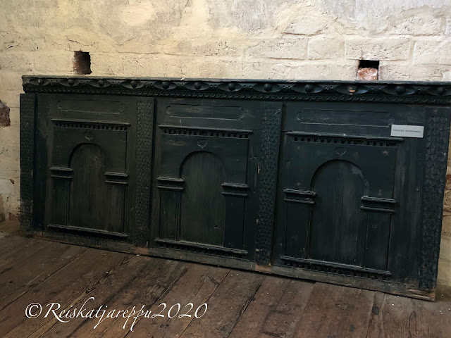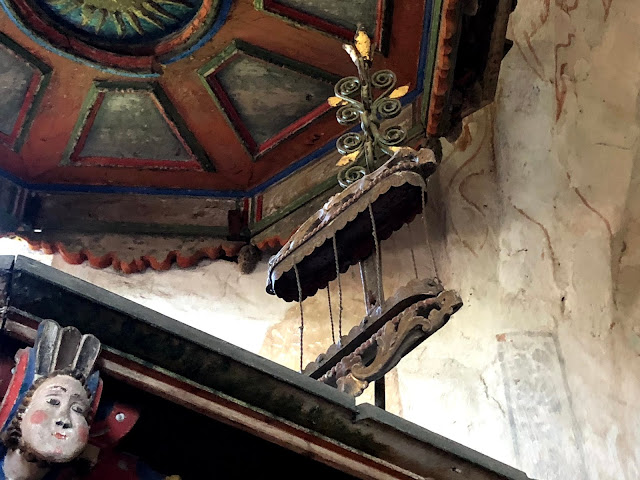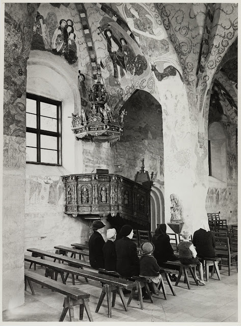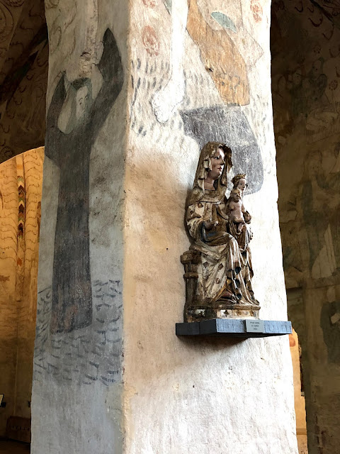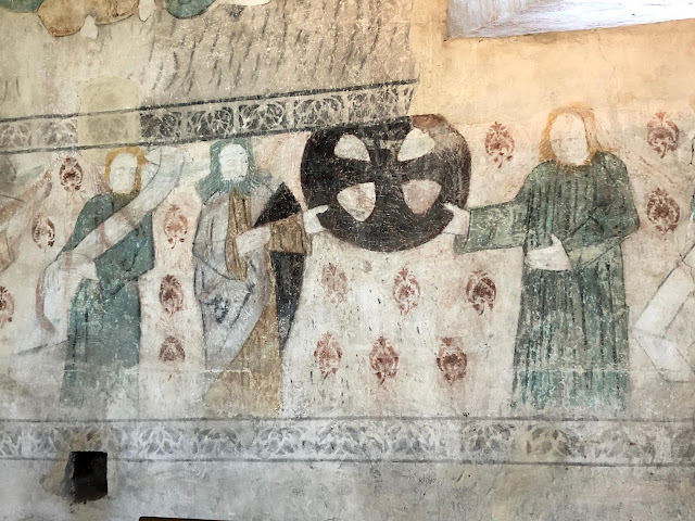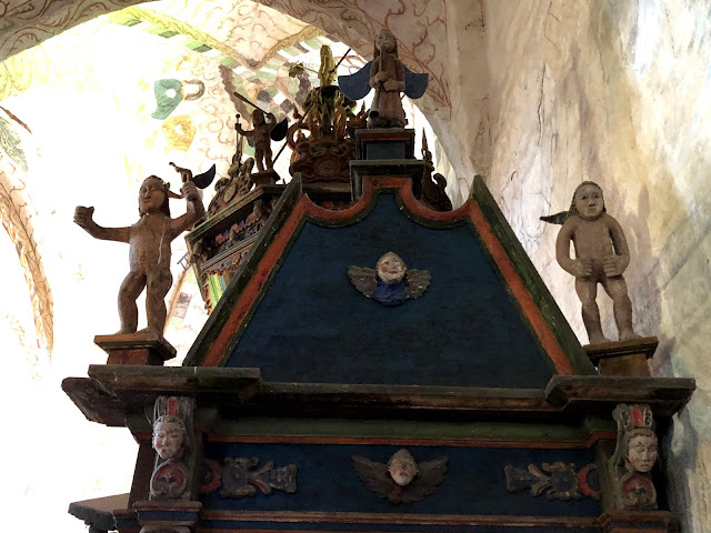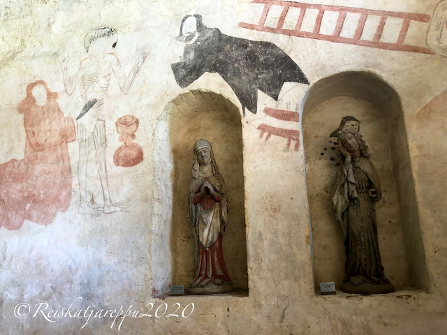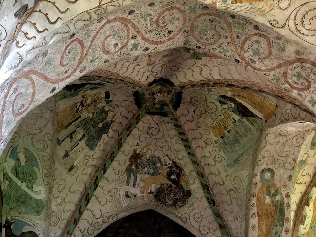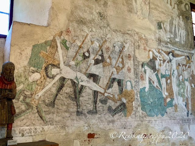 Kirkkosaliin astuminen sai hengen haukkomaan ja veti mielen hiljaiseksi. Mykistyminen johtui tästä kauniista näystä, joka oli suorastaan lumoava. Seinät täynnä koristemaalauksia, pää pyöri kuin hyrrä, ei oikein tiennyt minne katselisi. Puuveistoksia. Upea saarnastuoli ja toinenkin. Huh! Monessa keskiaikaisessa kirkossa olemme onneksi päässeet käymään sisällä ja silti jokainen näistä on ainutlaatuisensa. Mutta tämä on yksi häikäisemmistä. Ulkokuori ei koskaan kerro sitä, mitä sisältä voi löytyä.