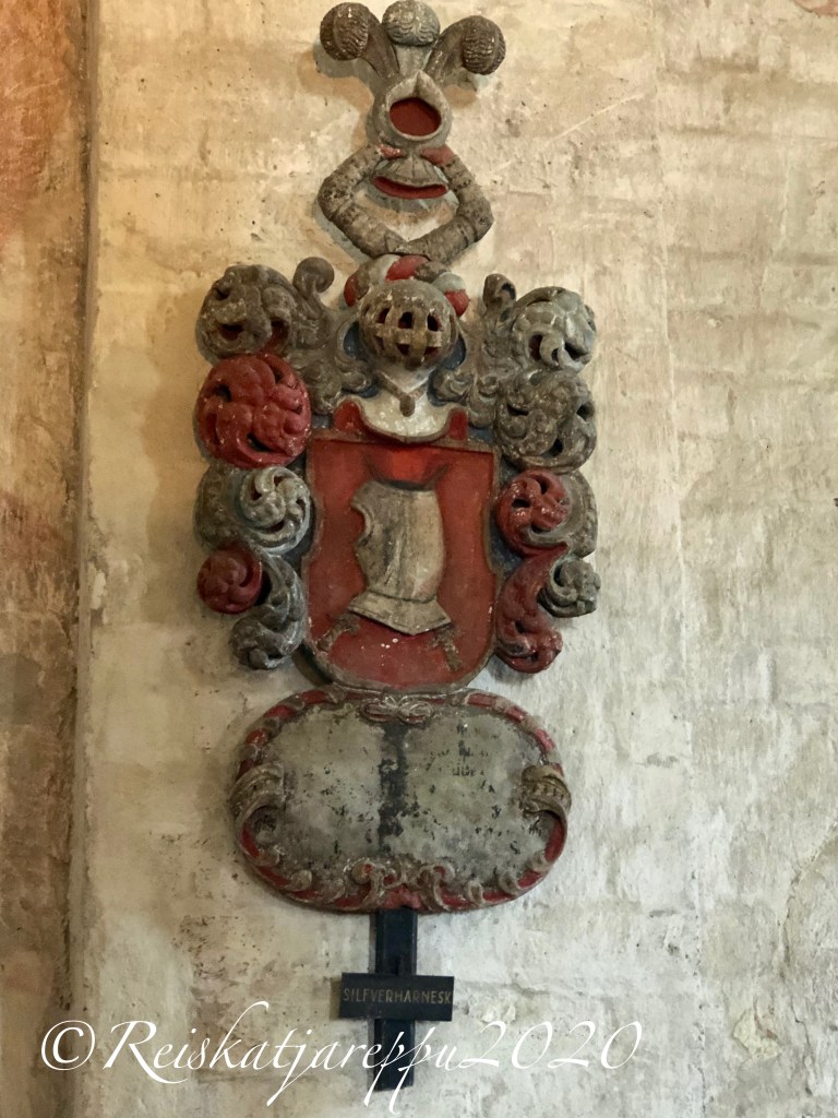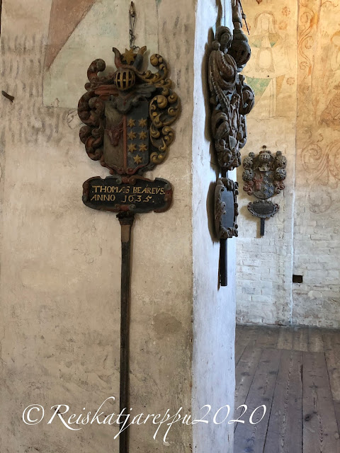 Kysymys varmaan kuultaa jo seinäpintojen ja maalausten läpi, eli kuka on maksanut nämä maalaukset. Kirkon maalaukset ovat kustantaneet Hämeenlinnan linnanherra Åke Tott, jonka suvun vaakuna on tuossa oikeassa pylväässä, värit ovat tosin haalistuneet, ne ovat olleet punainen ja keltainen. Samoin hänen vaimonsa Märta Bengtsdotter Ulv oli kustantamassa kirkon maalauksia, jonka suvun vaakuna on tuossa vasemmassa pylväässä, siinä näkyvä keltainen eläin on susi.