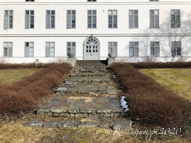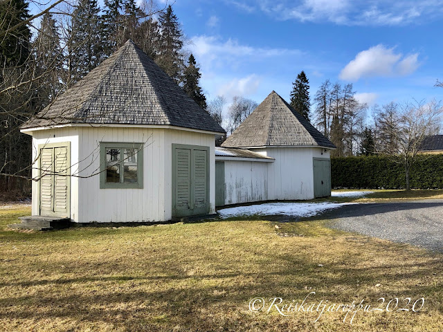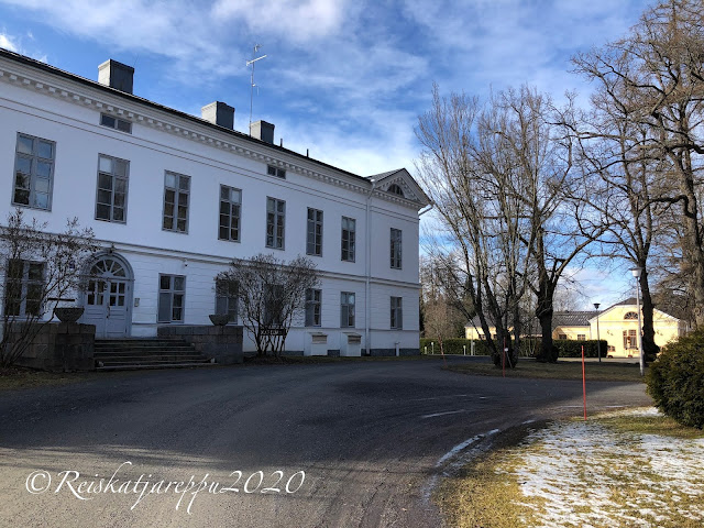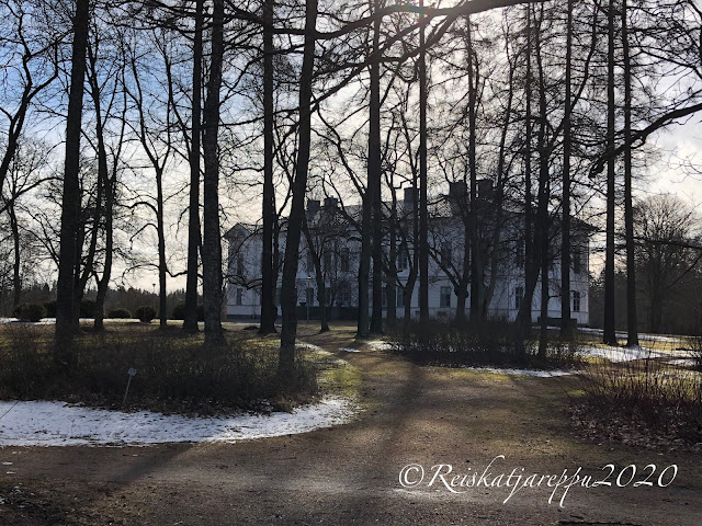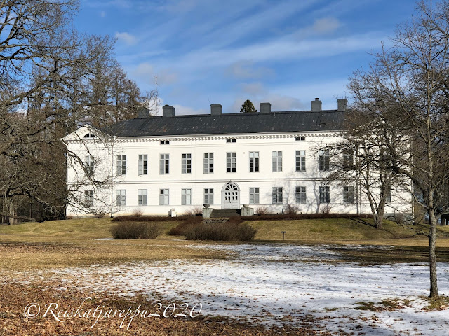 Jokioisten kartanon alue on viehättävä rakennuksineen sekä kartanopuistoineen. Jätimme auton tutun punaisen Tapulimakasiinin pihaan. Rakennus on huomiota herättävä kellotornineen, jonka jokaista sivua kello koristaa. Hyvä maamerkki.