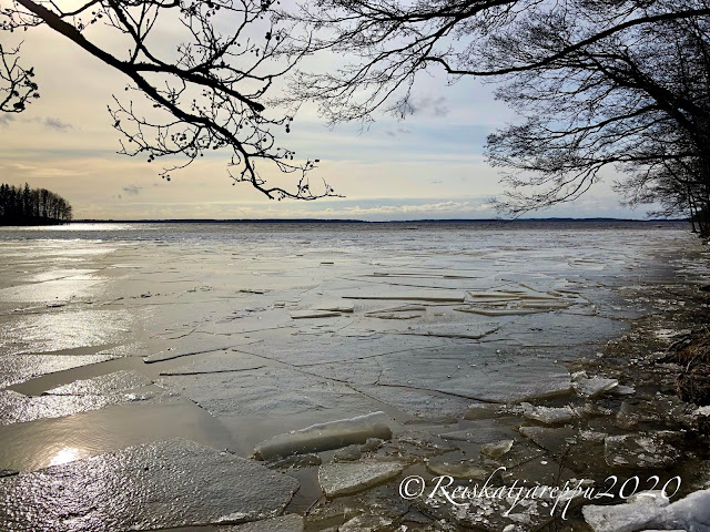 Koti kutsui kulkijoita ja lähdettin kotimatkalle. Kuitenkin kahvihammasta alkoi pakottaa ja huomattiin hieno pysähdyspaikka Portaantien varrella Pyhäjärven rannalla. Järven jäät olivat järven selältä lähteneet, mutta rannassa oli vielä ohuita jäälauttoja. Kyllä tuolla paikalla kehtasi kaffet juoda ja ihailla järvimaisemaa. Samalla rannalla ennen tätä P-paikkaa on Venesillan leirintäalue hienolla paikalla.