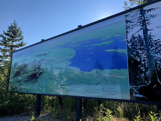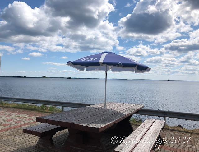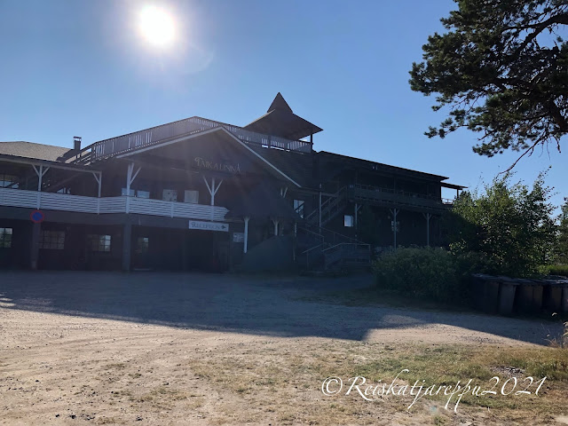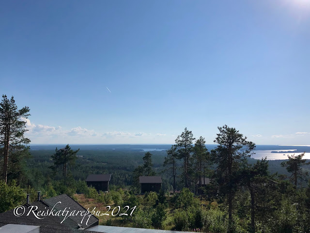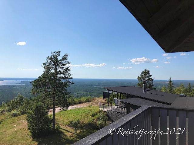 Kävimme ensin sisällä ravintolassa hakemassa jäähdykettä kuumutta vastaan. Jäätelö viilentää kivasti sisältäpäin ja lapsoset, ehkä myös vanhempi väkikin sitä nautiskelee mielellään. Sattui paikalla olemaan Jättiläismaan isäntä itse paikalla. Tuttu mies vuosien takaa ja mukava oli haastella menneestä ja toki nykyisistä asioista. Hän mielellään kertoili alueesta ja alueen kehittämisestä. Ohjasi meidät kattonäköalapaikalle katselemaan maisemia.
