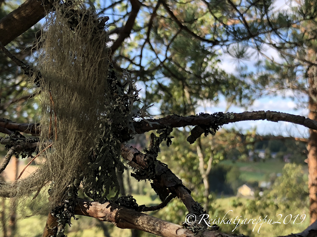 Noustuamme laelle ihailimme Halikon peltoja. Välillä mietimme, että täytyisi olla saha mukana, jotta saisimme raivattua näköalaa paremmaksi. Koivun oksia ja havunneulasia, risuja ja naavankappaleita. Hankalaa oli kuvata alhaalla olevaa maisemaa. Se näköalatornikin olisi poikaa. Sieltä voisi katsella Halikon peltoja. Miten kauas näkisikään.