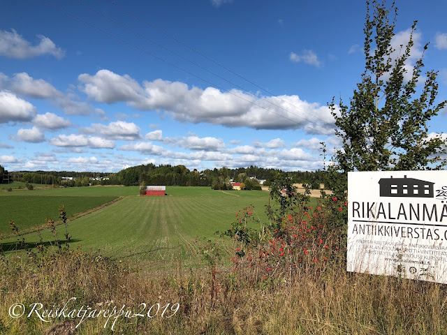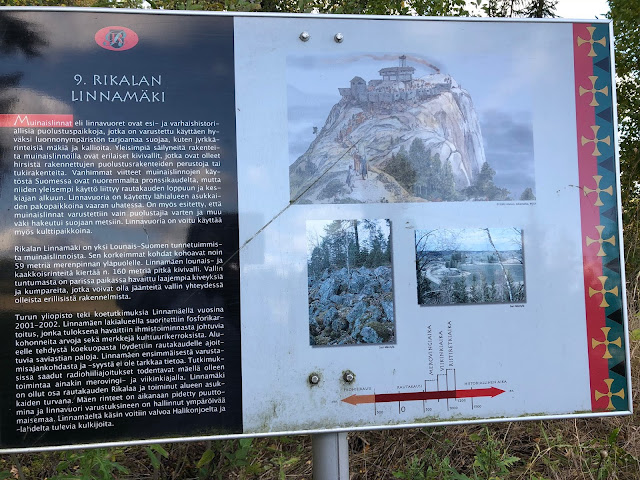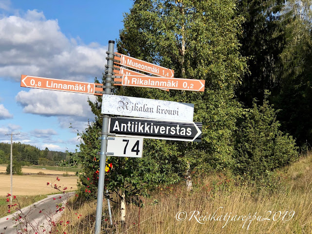 Rikalan Linnamäki sijaitsee Salon Halikossa. Isolta tieltä oli opaste Rikalanmäelle, josta löytyi helposti P-paikka. Mutta sitten opasteet johdattivat sinne ja tänne, pää menikin pyörälle opasteista. Oli Rikalanmäen krouvia, oli muinaispolkua, luontopolkua, museosiltaa jne. Suuntasimme Rikalan krouvia kohti ja päästyämme pihaan, nainen ohjeisti meidät oikealle suunnalle. Menimme noissa viitoissa sekaisin.