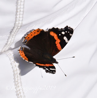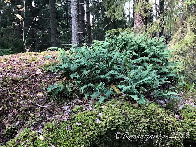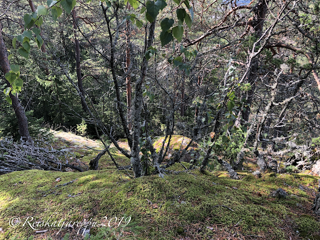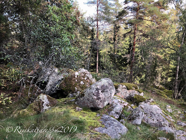 Polku oli niin epäselvä ja ruohottunut, että jätimme yrityksemme omenapuun luokse ihaillaksemme amiraaliperhosta. Krisse halusi ottaa amiraalista kuvan, mutta ennen kameran esiinottamista, perhonen lennähti minun takin selkään. Jähmettyneenä seisten Krisse sai ikuistettua syksyisen perhosen. Palasimme autolle jatkaaksemme matkaa. Saloa kohti ajaessamme ohi Rikalanmäen, näimme valkoisia kylttejä mäen alapuolella, jotka kertoivat muinaishaudoista, mutta sinne ne jäi, huonon kulkuyhteyden takia. Olimme kyllä pettyneitä. Salon kaupungin sivuilla nähtävyyttä mainostetaan Muinaispolkuna, mutta se kyllä näytti aivan unohdetulta, tosiaan muinaispolulta.
