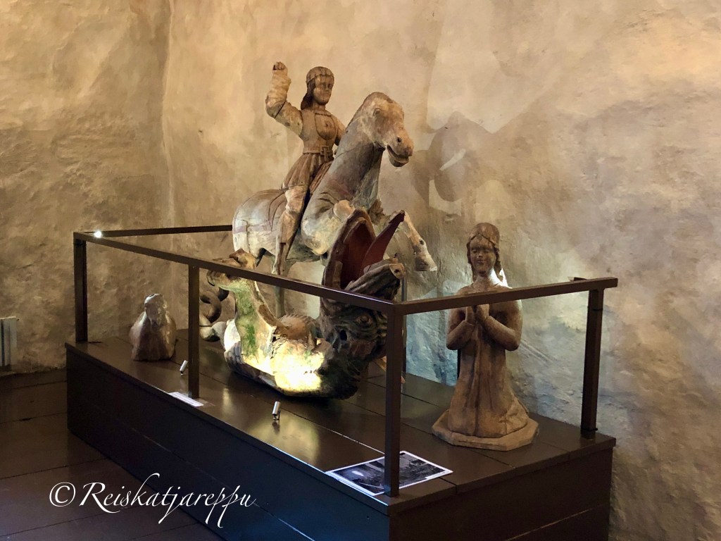 Oikealla oleva puuveistos on Maria ja Jeesuslapsi. Oletetaan, että se on tehty todennäköisesti Tukholmassa 1400-luvun loppupuolella lyypekkikäisen mestarin johdolla.