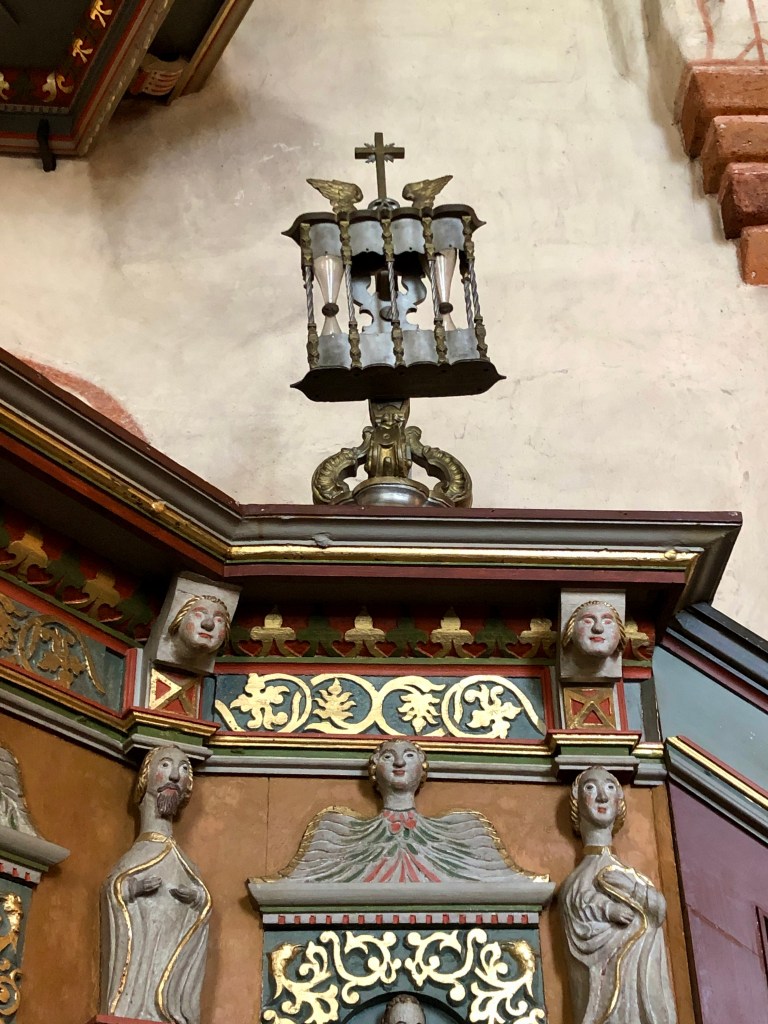 Vihkiristejä seinillä on näkyvissä 11, yleensä niitä on 12, eli neljä sivuseinillä ja päädyissä 2. (Vihkiristi = pappi pirskotti pyhää vihkivettä kirkon seinille. Vettä laitettiin kahteentoista kohtaan ja niihin kohtiin maalattiin vihkiristi apostolien symboleina).