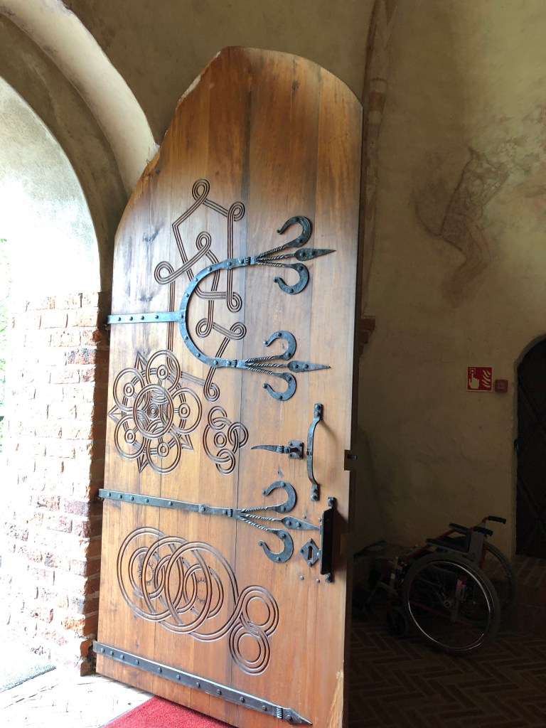 Vanha ulko-ovi asehuoneeseen on uusittu entisiä kuvioita ja takorautaosia kopioiden. Vanha ovi on nähtävillä asehuoneessa. Uuden ulko-oven takana näkyy ovi, joka johtaa portaikkoon, mistä pääsee ulkosaarnastuoliin.Asehuoneen ovi kirkkosaliin takorautakoristeineen on Suomen hienoimpia. Asehuoneen ovea koristaa kuvasarja Hubertuksen metsäretkestä. Viimeaikaiset tutkimukset olettavat kyseessä olevan pyhä Eustachius. (Keskiaikaiset kirkot, Markus Hiekkanen). Ylin ovi on asehuoneen ovi. Alhaalla oikealla vanha, alkuperäinen ovilevy ja vasemmalla uusi, kopioitu ovilevy.