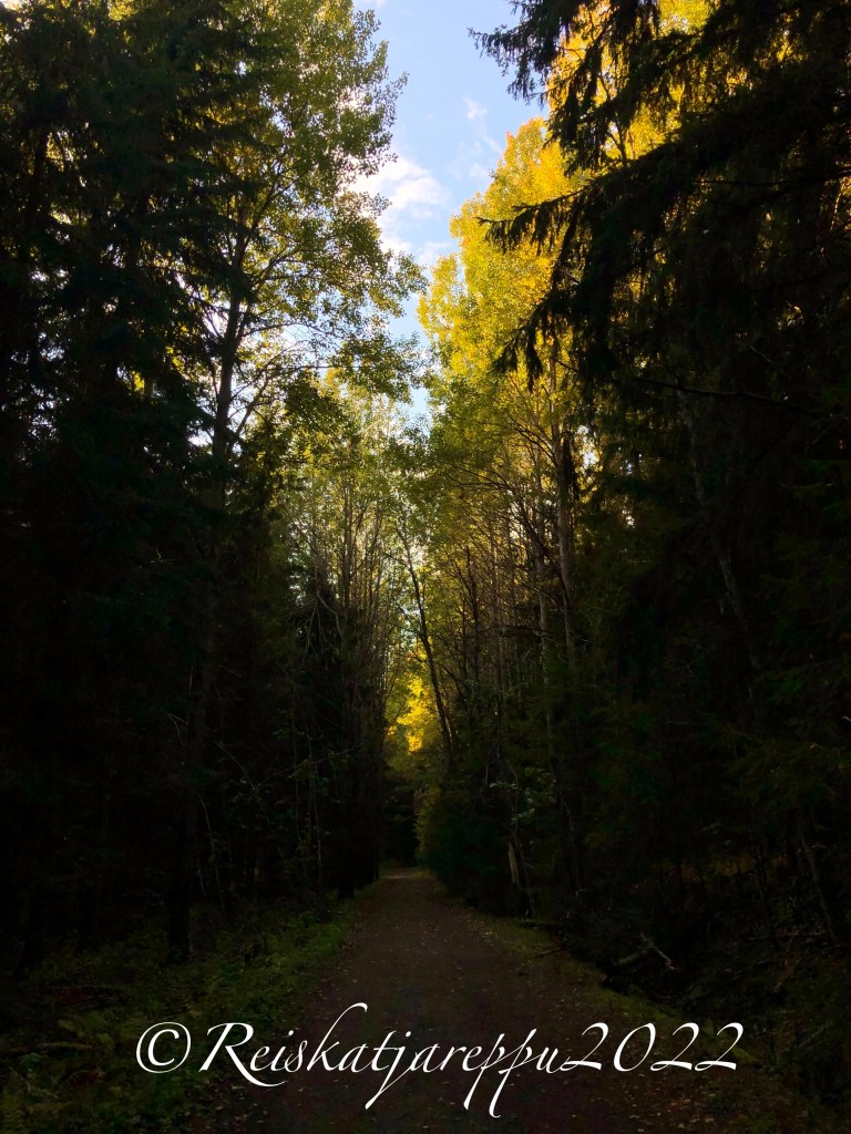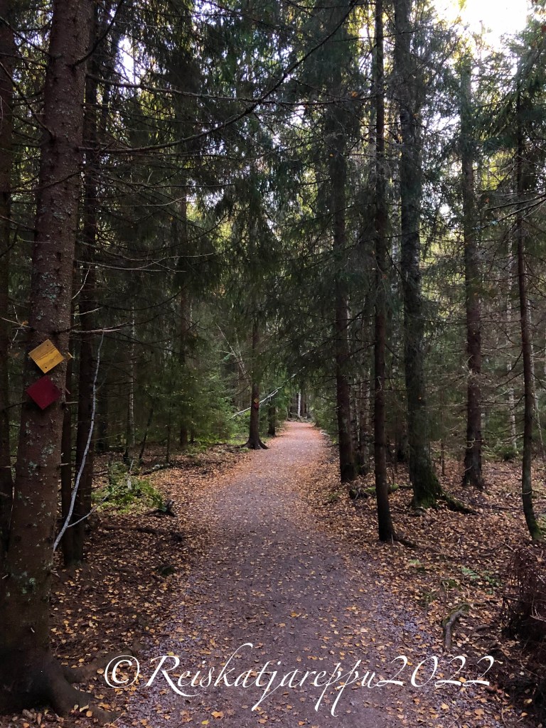 Alkumatka oli helppokulkuista, tasaista tallustamista. Puut olivat korkeita ja niin tiheitä, että auringonpaisteen näki vain puidenlatvoissa. Syksyn tuoksun tunsi ilmassa ja puut olivat jo osin tiputtaneet lehtensä. Rauhallista ja hiljaista.