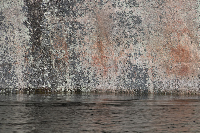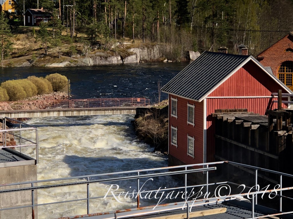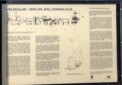 Verlantien varrella oli omakotitaloja, joten pysyvää asutusta on. Saavuimme kosken niskan edustalla olevalle parkkipaikalle. Parkkipaikka sijaitsi voimakkaasti virtaavan vesistön rannalla. Näimme kyltin kalliomaalauksista joka oli aivan parkkipaikan tuntumassa. Laiturilta näki maalaukset, jotka olivat kyllä hyvin vaikeasti tulkittavia.