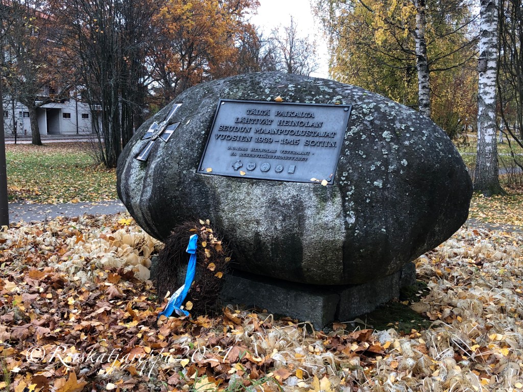 Maaherran puisto on oikea patsaiden valtakunta. Eli muistolaattoja ja patsaita. Tässä kivessä laatta: Tältä paikalta lähtivät Heinolan seudun maanpuolustajat vuosien 1939-1945 sotiin.