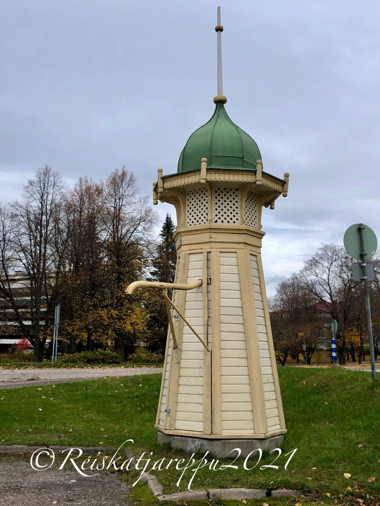 Puiden läpi häämöttää Heinolan vesitorni. Maamerkki sekin. Se on valmistunut vuonna 1951 ja se on arkkitehti Kaarlo Könösen suunnittelema.