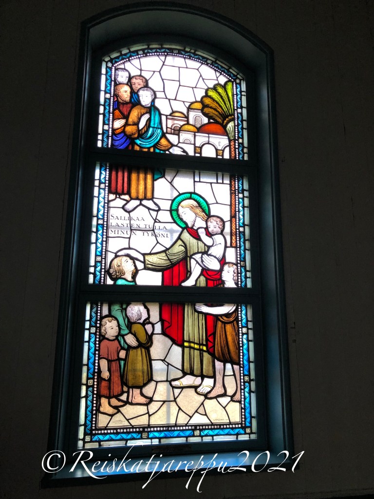 Lasimaalaukset ovat Gunnar Forsströmin (1894-1958) suunnittelemat vuonna 1933 ja S.Wuorion lasimaalaamossa Helsingissä valmistettu.
