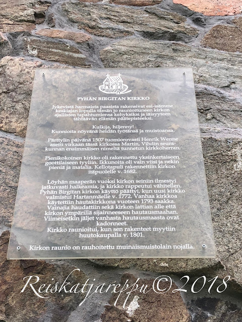 Oli juhannus, tuo keskikesän juhla vaihtelevine ilmoineen. Myrsky ja vesisade riepotteli kesän juhannusaaton juhlijoita, mutta sentään räntäsateilta vältyttiin. Myrskyisen aaton jälkeen juhannusaamu valkeni aurinkoisena. Viime vuoden kesäisen kaunis juhannusaaton päivä ja muistoissa siintelevä Pyhän Birgitan kirkon raunioiden lähellä oleva Kirkkojärven kaunis maisema sai meidät suuntaamaan Vihtiin. Vihdin keskustaan tullessamme rakennukset näyttivät tutuille ja kirkko seisoi oikealla ylväästi mäen päällä tutun keltaisessa asussaan.