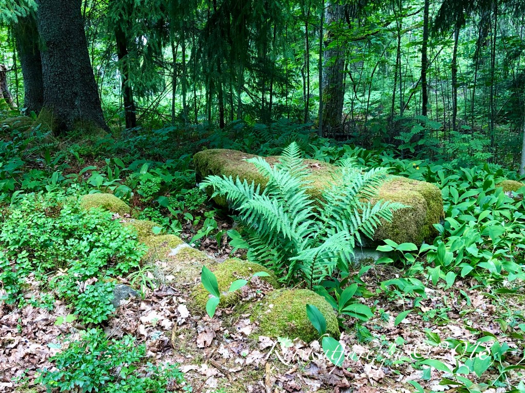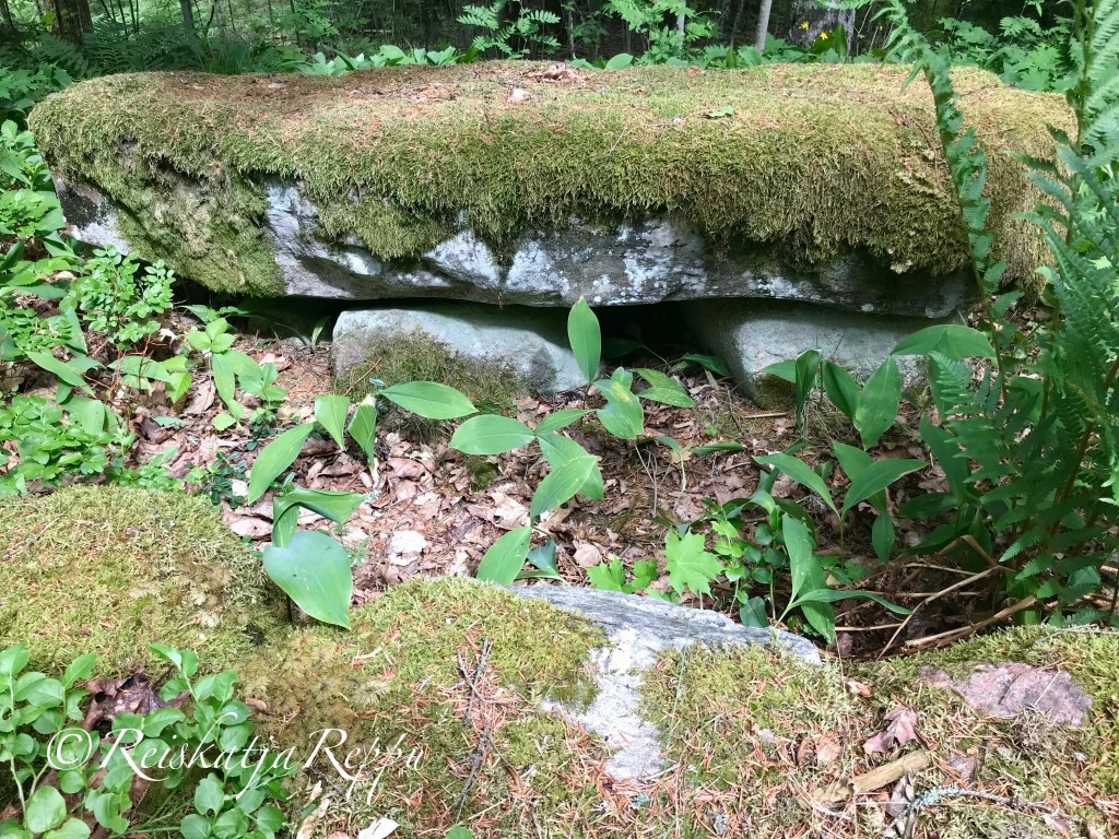 Kävelimme ja pyörimme google-kartan kanssa, joka näytti meille paikan olevan lähellä käräjäkiviä. Saavuimme takaisin autolle ja siinä näimme polun tapaisen, jota pitkin kävellessä löysimme kivet. Kivet olivat sammaloituneet kauniisti ja luonnon kesäinen kasvillisuus melkein hukutti ne.