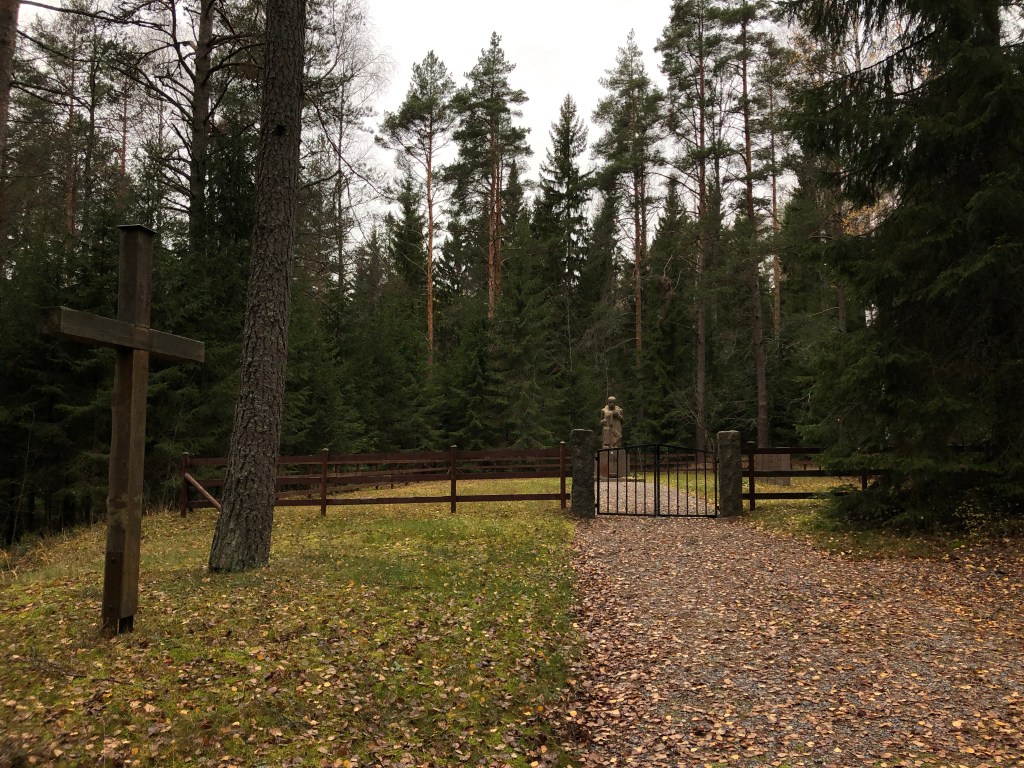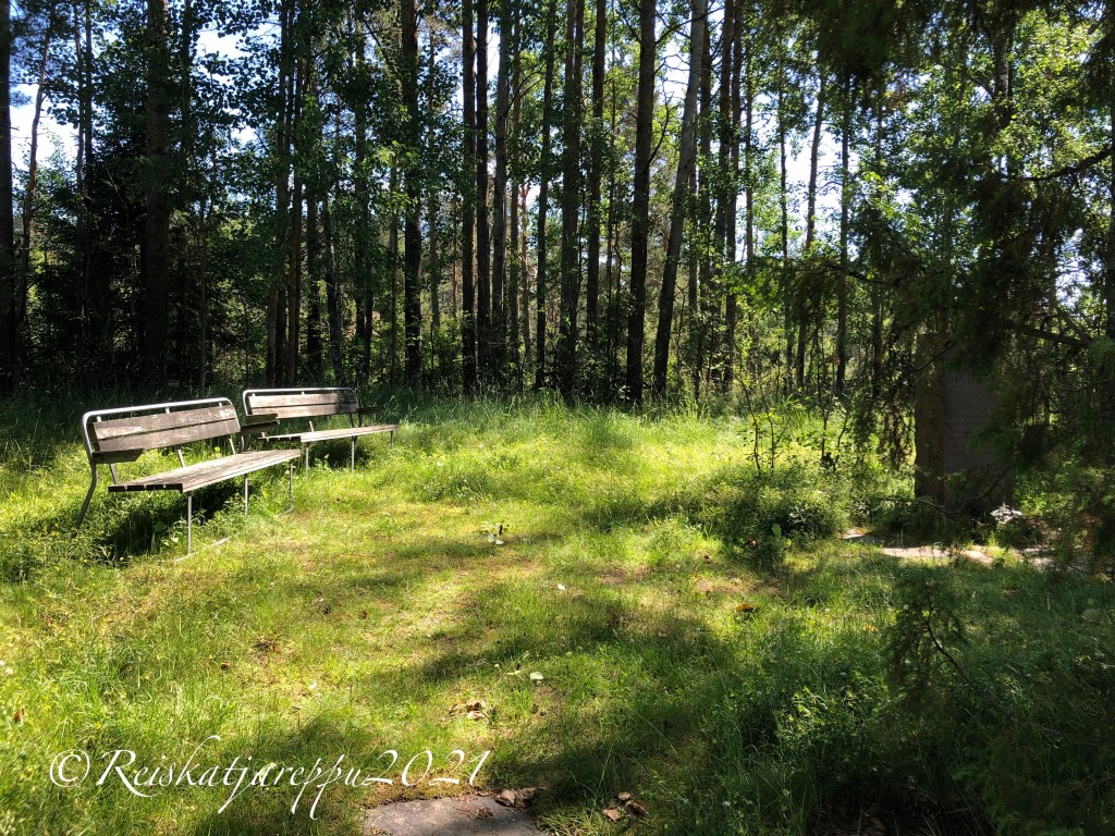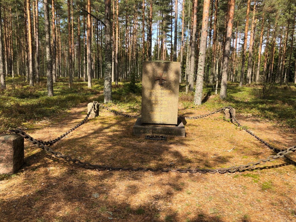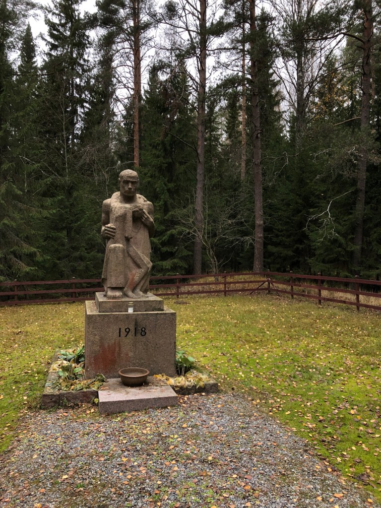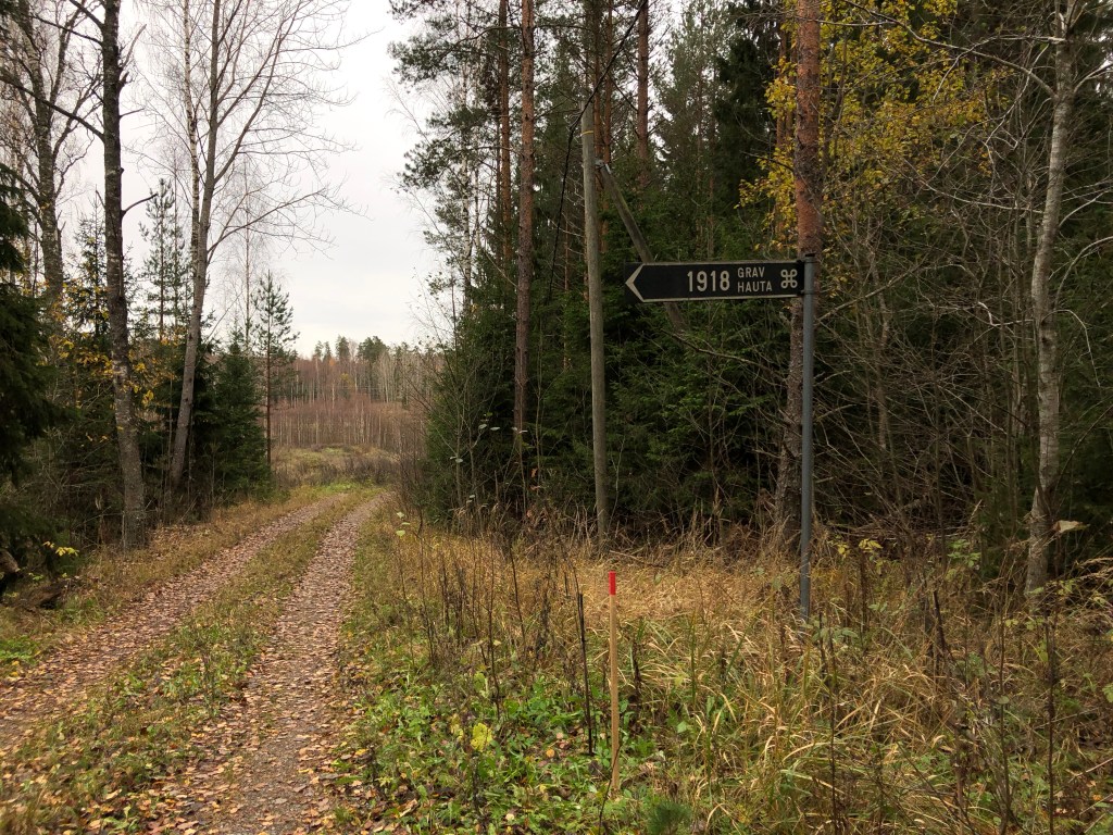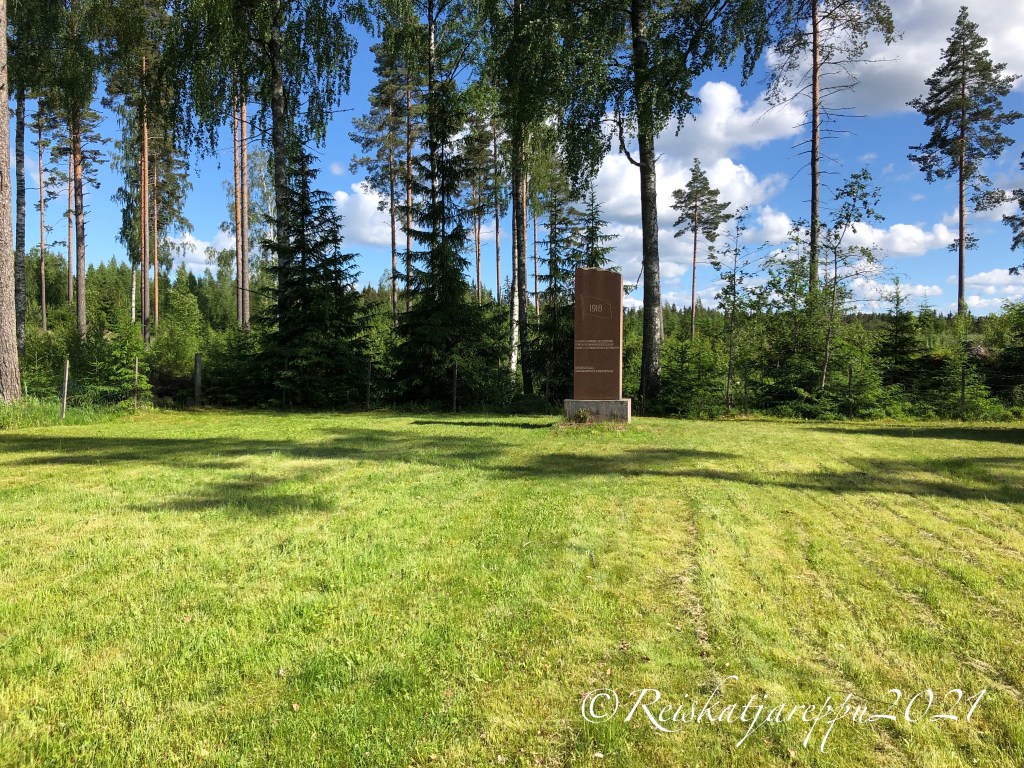 Moni on varmaan huomannut ajellessaan Inkoon Rannikkotietä nro 51, että matkan varrella on viitta Hauta 1918. Niin mekin. Kerran, yhtenä päivänä tullessamme Karjaalta päätimme käydä katsomassa mikä paikka se on. Hiekkatietä oli yllättävän pitkä matka ajella, vai tuntuiko se siltä. Tiedä häntä, mutta lopulta löysimme parkkipaikalle, josta oli vielä käveltävä metsän läpi hautapaikalle. Hämmästys oli suuri, kun keskellä metsää oli todella aidattu alue muistomerkkeineen.