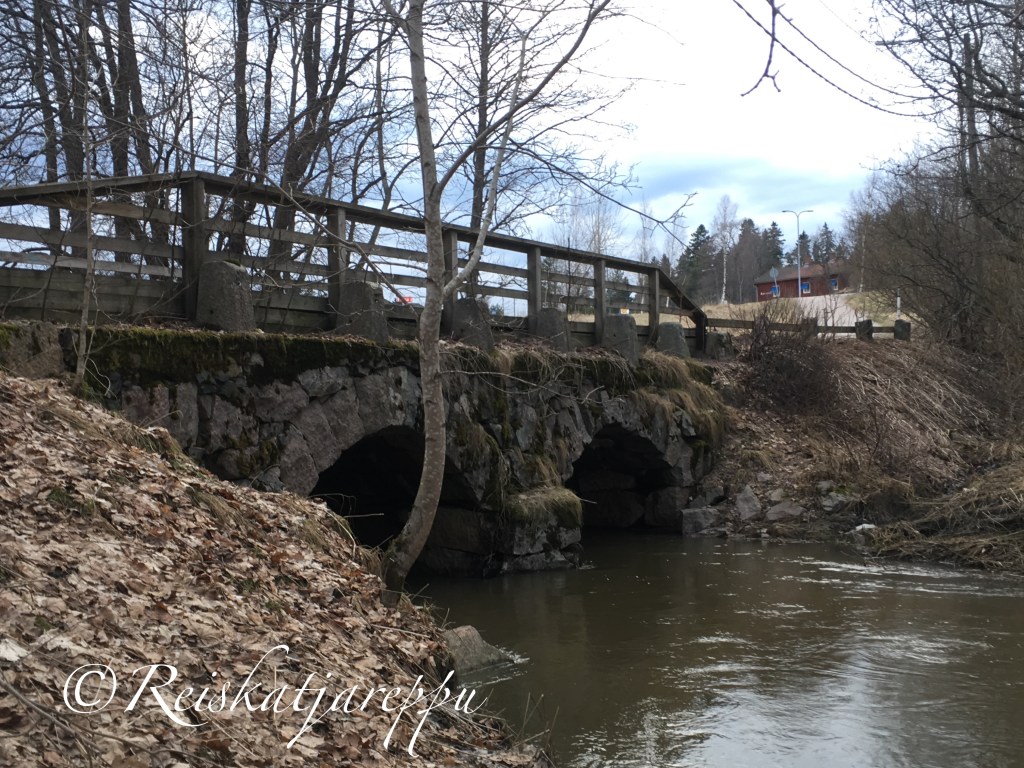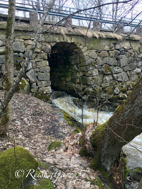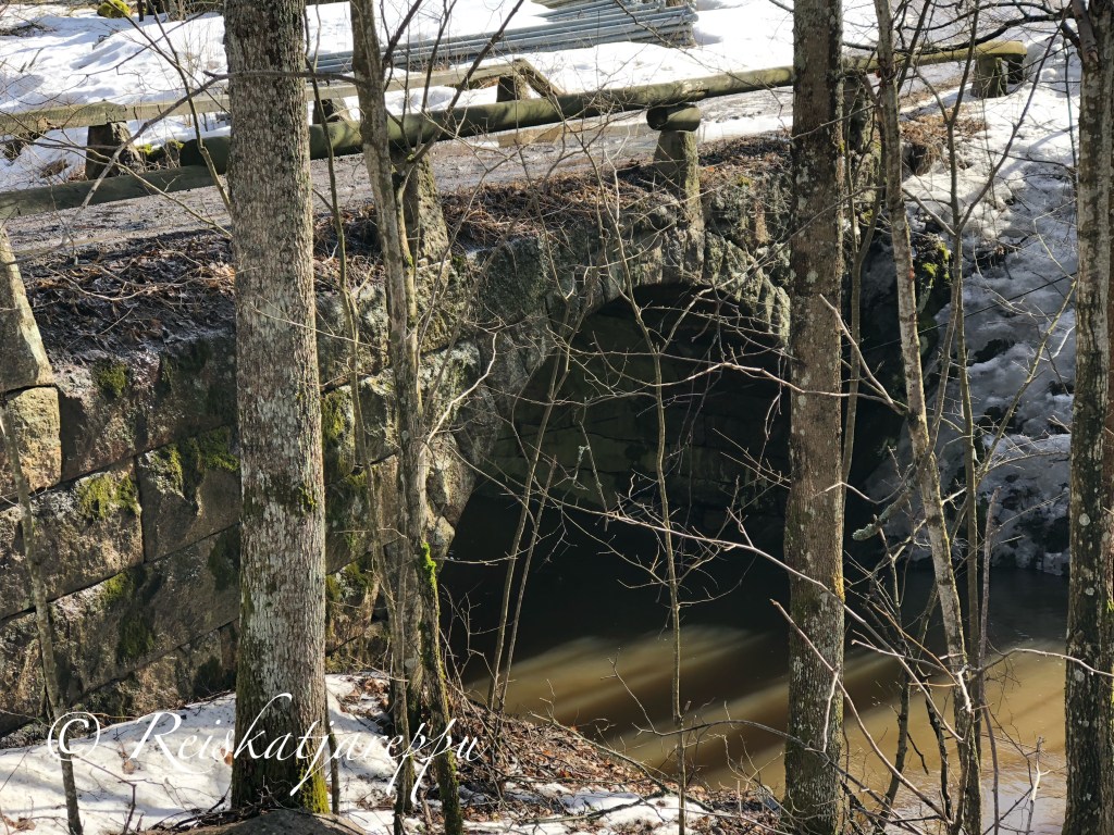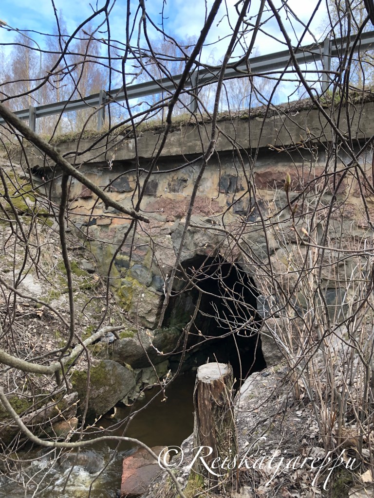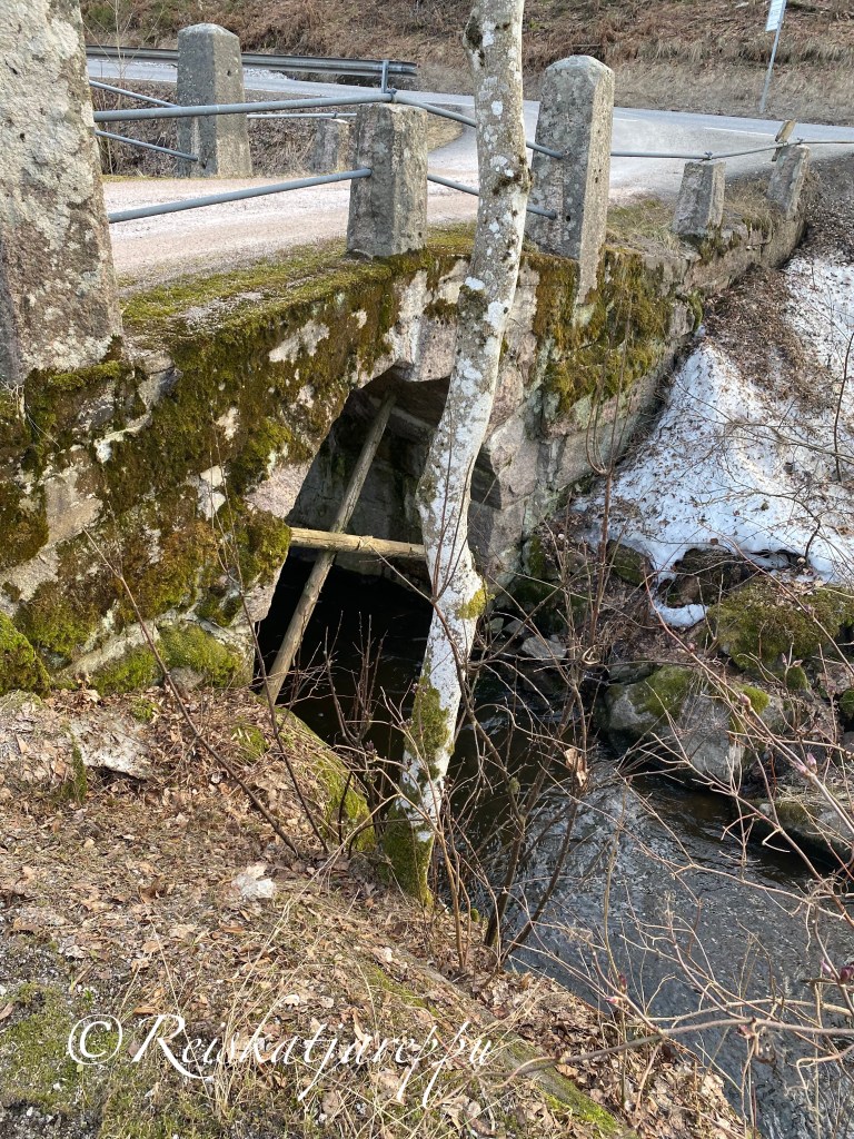 Komea silta on jäänyt vähän unholaan, pois näkyvistä. Purosessa oli niin vähän vettä, että kävimme tutkimassa, miltä sillan sisällä näyttää. Kevätaika on hyvä siltojen tukimiseen, koska puut lehtineen eivät ole haittaamassa näkyvyttä.