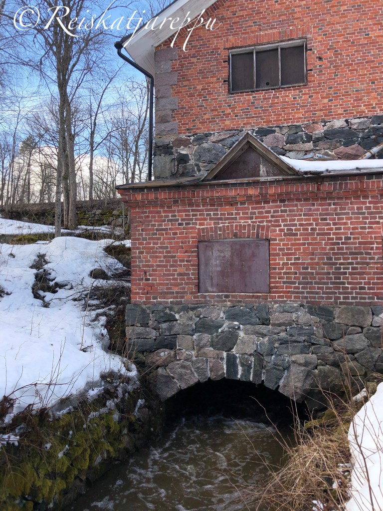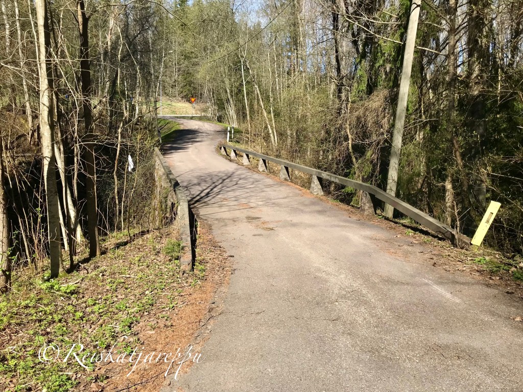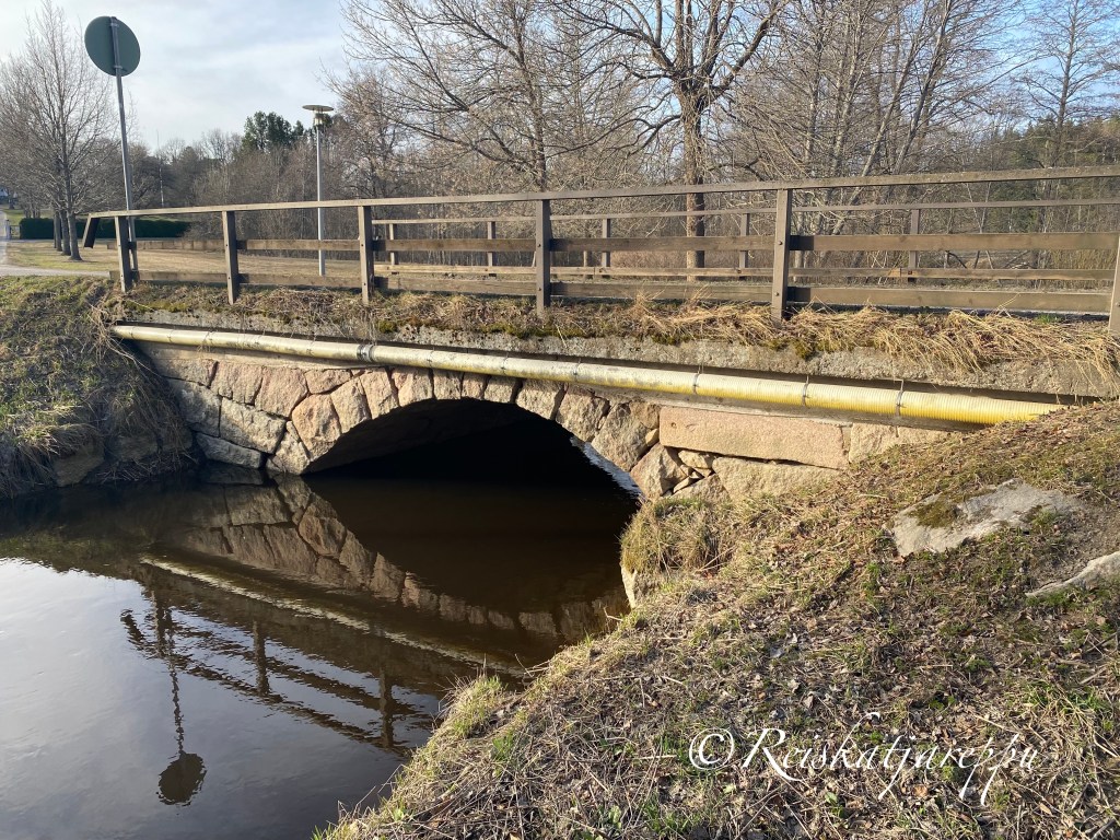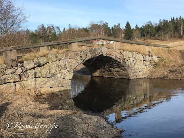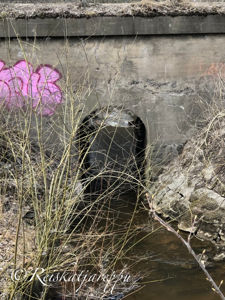 Komea silta on jäänyt vähän unholaan, pois näkyvistä. Purosessa oli niin vähän vettä, että kävimme tutkimassa, miltä sillan sisällä näyttää. Kevätaika on hyvä siltojen tukimiseen, koska puut lehtineen eivät ole haittaamassa näkyvyttä.