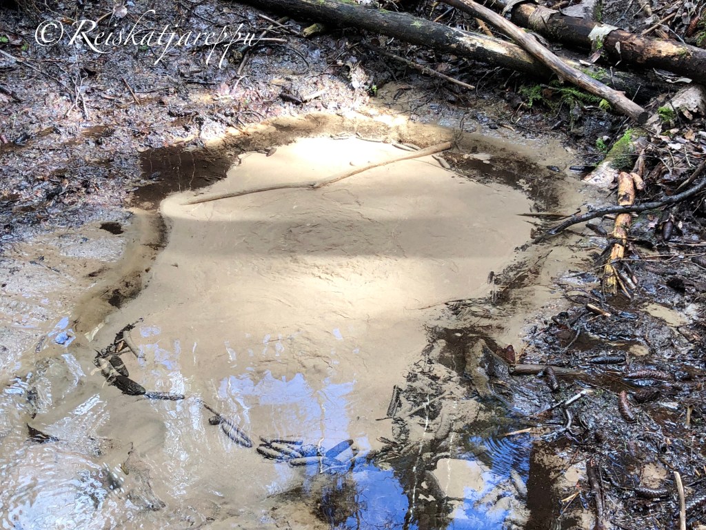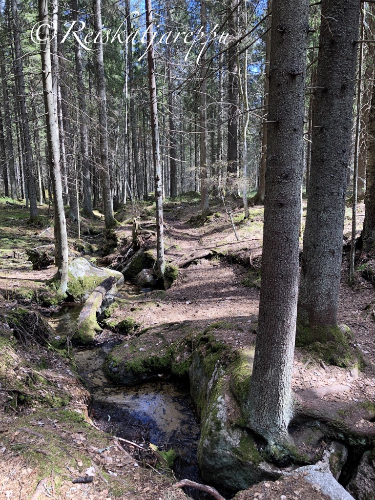 Löysimme lähteelle Krissen avustuksella ja nti navin ohjeiden mukaan autolle paikan. Näimme miehen kottikärryineen tulevan metsästä ja kysyimme häneltä, että olemme oikealla paikalla. Jeps, kerralla satuttiin oikeaan paikkaan. Jätettiin auto kääntopaikalle ja hypättiin polkua pitkin metsän uumeniin.