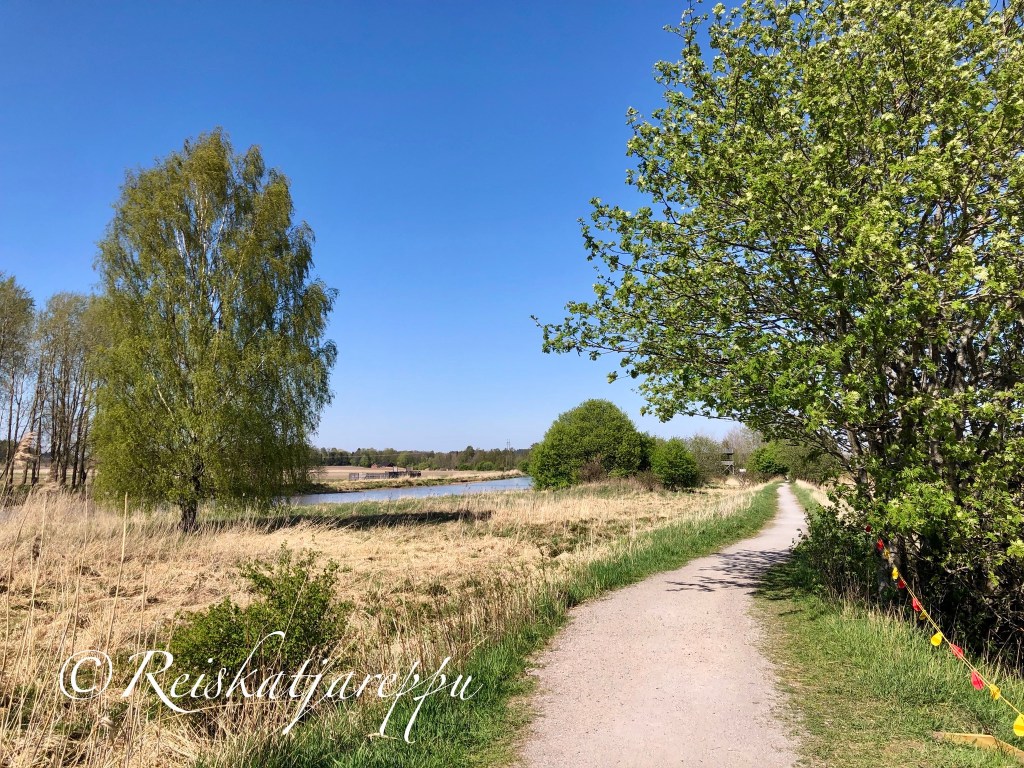 Jatkoimme matkaamme lintulavalle ja sitten seuraavalle lintutornille. Polku oli kiva puiden suojassa. Puissa hennon vihreät lehdet kahisivat hiljaa, pörriäisiä ja perhosia lenteli etsiessään kukkien mettä. Kaunista on keväinen luonto hetki ennen täydellistä heräämistään. Meilläkin olisi ollut täydellistä nauttia luoononrauhasta, mutta se musiikin jumputus vain häiritsi elämää.