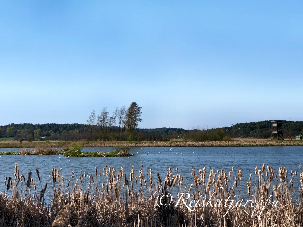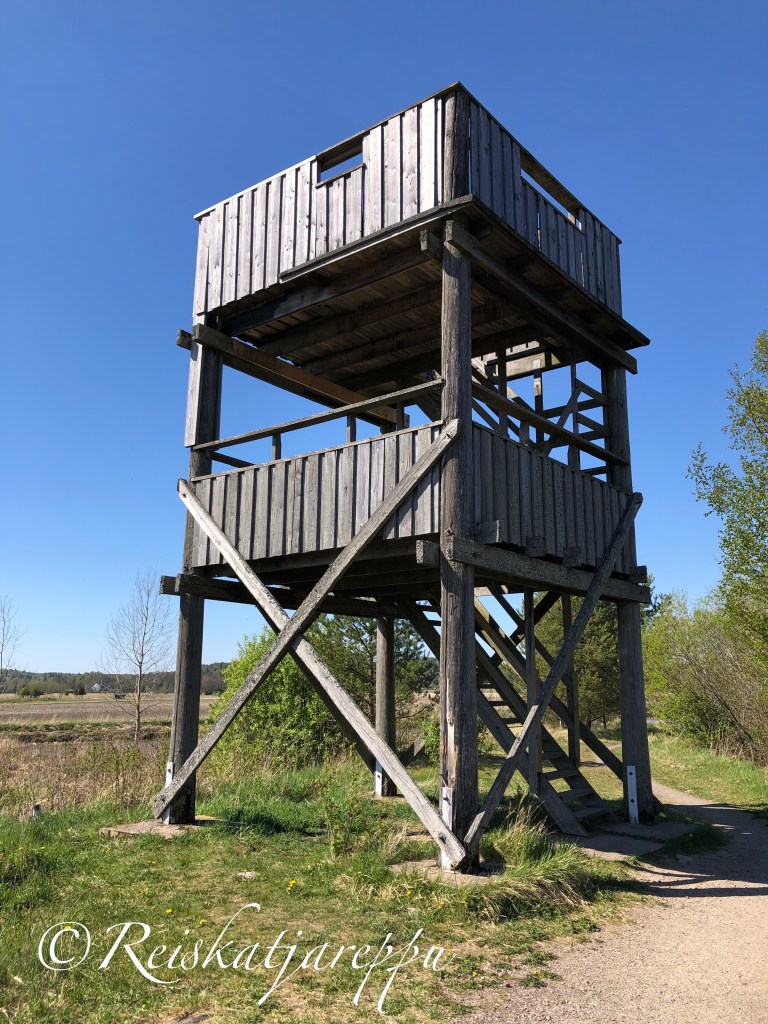 Tanssijoiden jälkeen matka taittui rauhallisemmin. Ihmisiä keväinen sää oli saanut liikkumaan, mutta ei ruuhkaksi asti. Ensimmäinen lintutorni oli vallattu, joten piipahdimme ihailemassa maisemia ensimmäiseltä tasanteelta. Käytiin piilokojulla kurkkimassa näkyykö lintuja, mutta emme nähneet kuin kuvassa näkyvät osmankäämän tupsukat ja kojussa olleet vanhat hylätyty lintujen pesät.