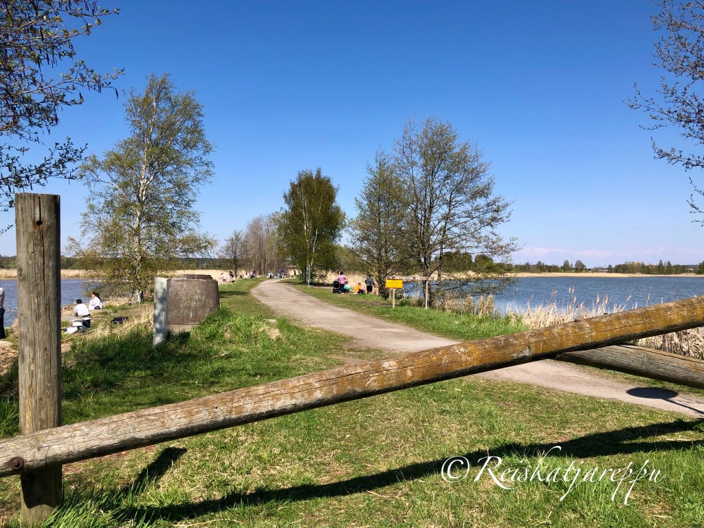 Auto jätettiin polun aloituspäähän parkkiin ja ihmisiä oli aikas paljon rannoilla ongella ja piknikillä. Jopa muutama kaveri tanssi tiputanssia viinipullon kanssa, lintupolun innoittama. Musiikki pauhasi siihen malliin, että luonnonrauhasta ei ollut tietoakaan. Edes lokkien kirkunat eivät olisi meitä häirinneet, mutta kovaääninen musiikki särki korvia. Joku laki täytyisi olla näille kivoille luontopaikoille, että turha metelöinti ja musisointi on kielletty.