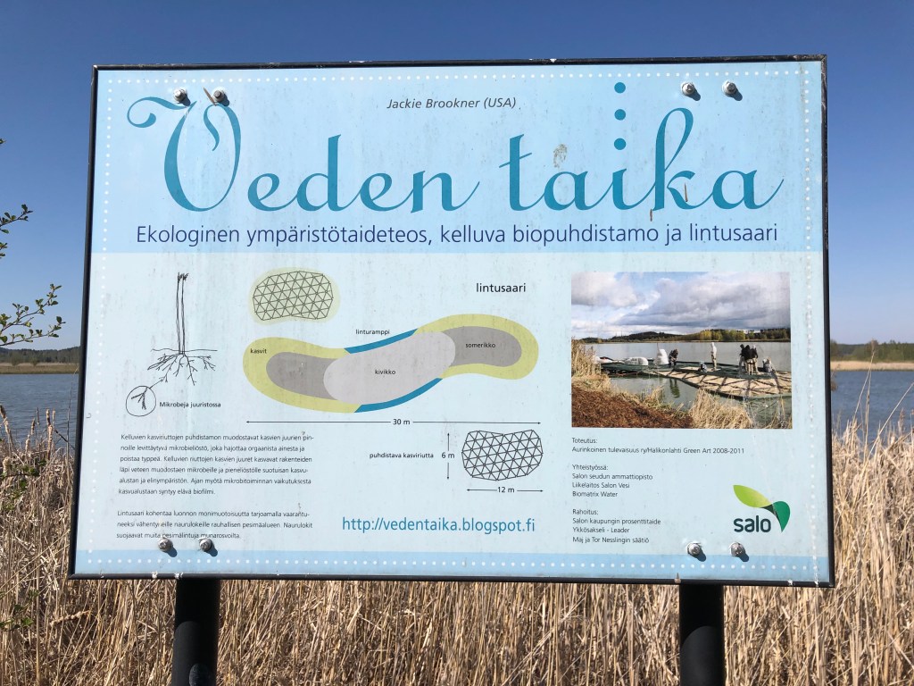 Tämä oli mielenkiintoinen. Eli keskellä jätevedenpuhdistamon allasta on pieni saari, jossa lokit riitelivät pesimäpaikoista. Selvisi, että saari on nimeltään Veden Taika eli The Magic of Water- niminen ympäristötaideteos/ bioteos, jonka on suunnitellut yhdysvaltalainen Jackie Brookner. Teos koostuu kahdesta puhdistuselementistä ja lintusaaresta. Se on valmistunut vuonna 2009. Mielenkiintoisin, mikä meidän silmiin pisti oli, että lintusaarella on tarkoituksena antaa vähentyneille naurulokeille rauhallinen pesimäalue. Siksi, että pääkaupunkiseudulla näkyy vielä naurulokkeja riittämiin asti.
