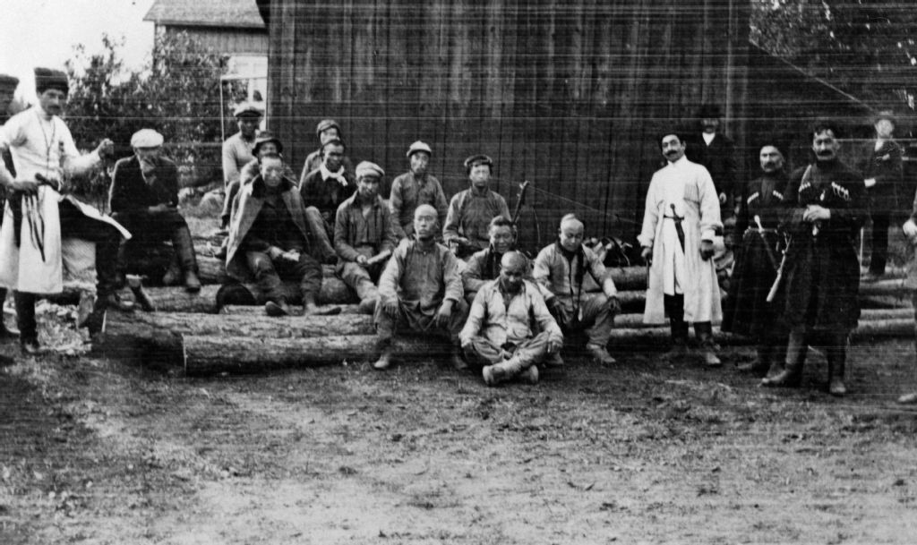 Kiinalaisia linnoitustyömiehiä ja heidän vartijoita yhteiskuvassa I maailmansodan aikana Nissbackassa.