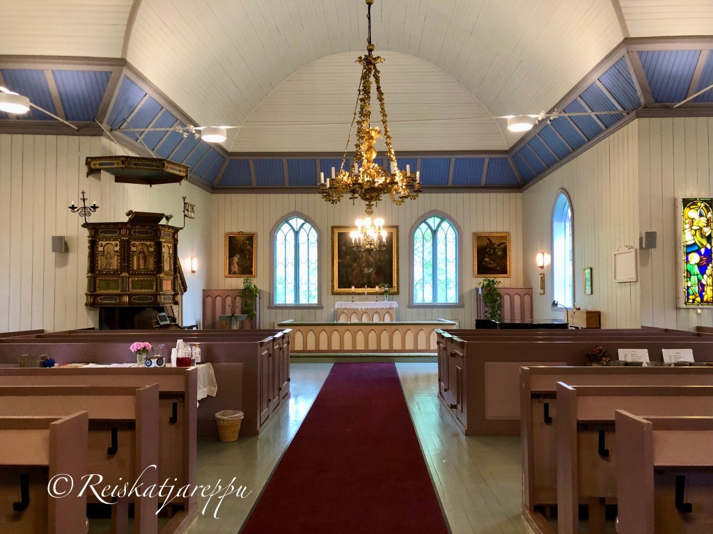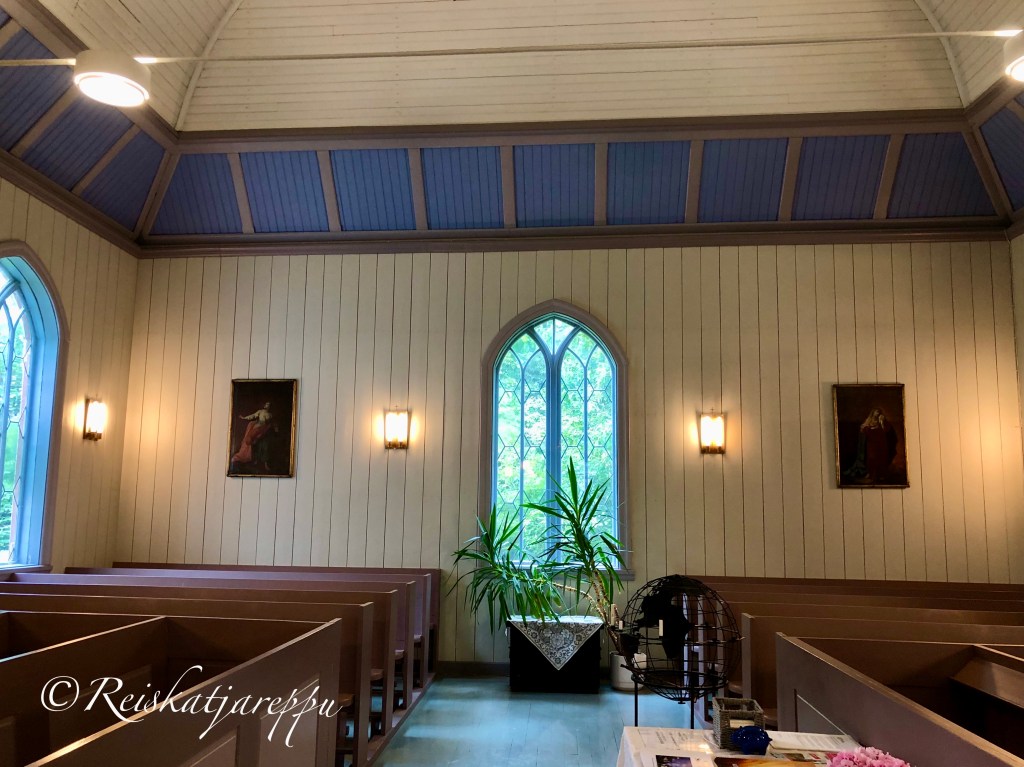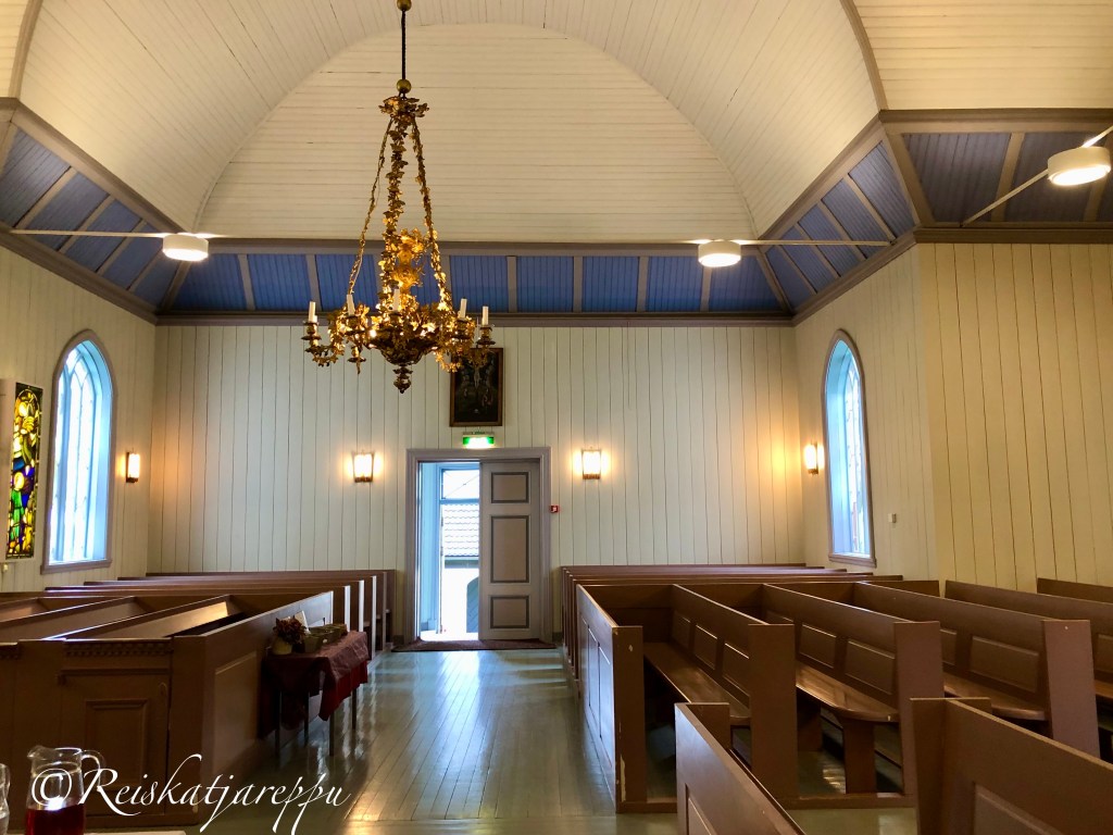 Kirkkosaliin astuessa hämmästyy, kirkko on niin valoisan ja hyvin kauniin harmonisen oloinen, jossa on lämmin sisustus. Ystävällinen kirkko-opas oli paikalla, ensimmäiseksi hän kehoitti meitä ottamaan tarjolla olevaa mehua ja keksejä. Samalla hän kertoi ja tarinoi kirkon historiasta meidän nautiskellessa anniskeluista.