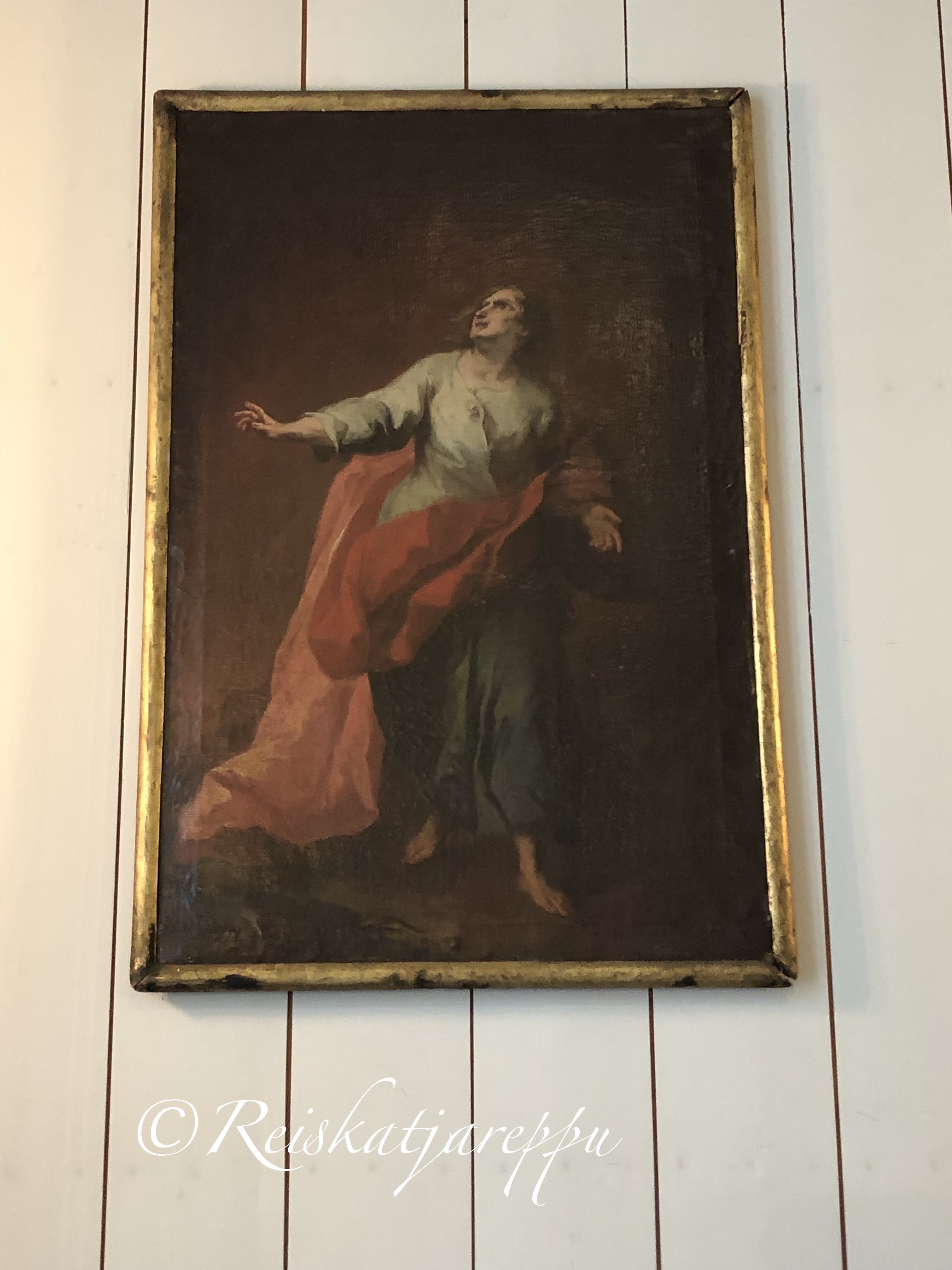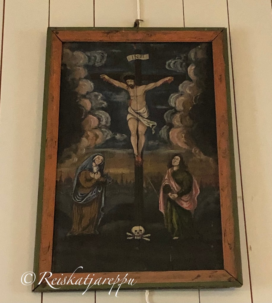 Kirkon vanha alttaritaulu sijaitsee ulko-oven päällä. Ristiinnaulattua Kristusta esittävä taulu on 1600-luvun lopulta tai 1700-luvun alusta.