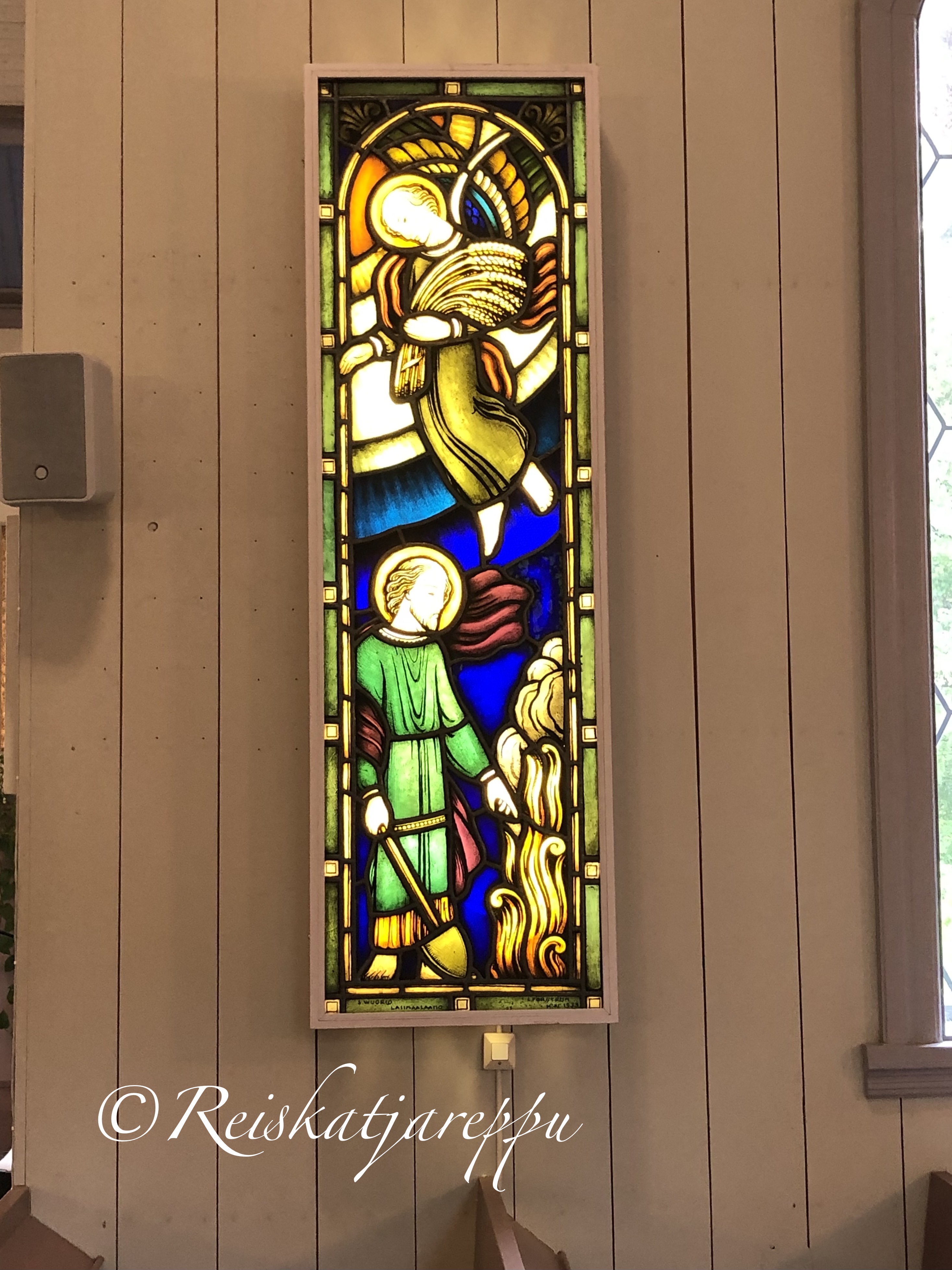 Kirkon seinällä on Gunnar Försstömin valaistu lasimaalaus ”Kylvö ja sadonkorjuu”, joka on vuodelta 1986.