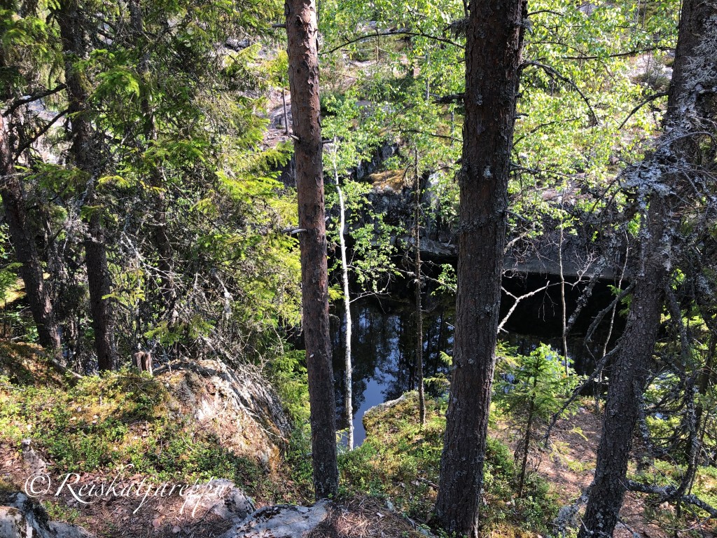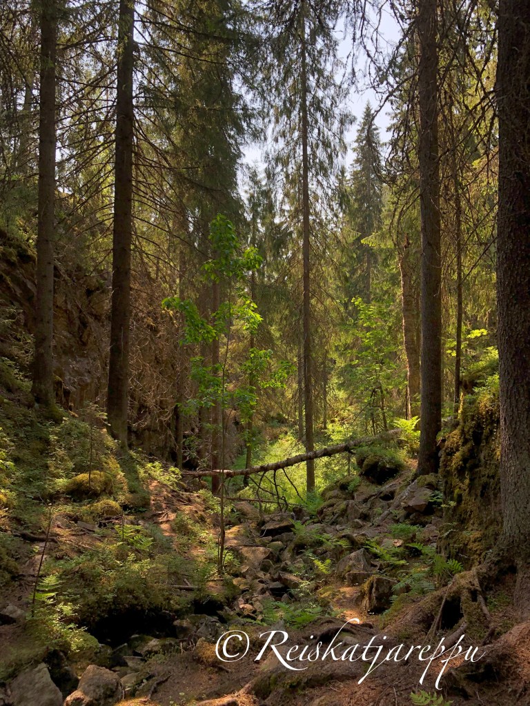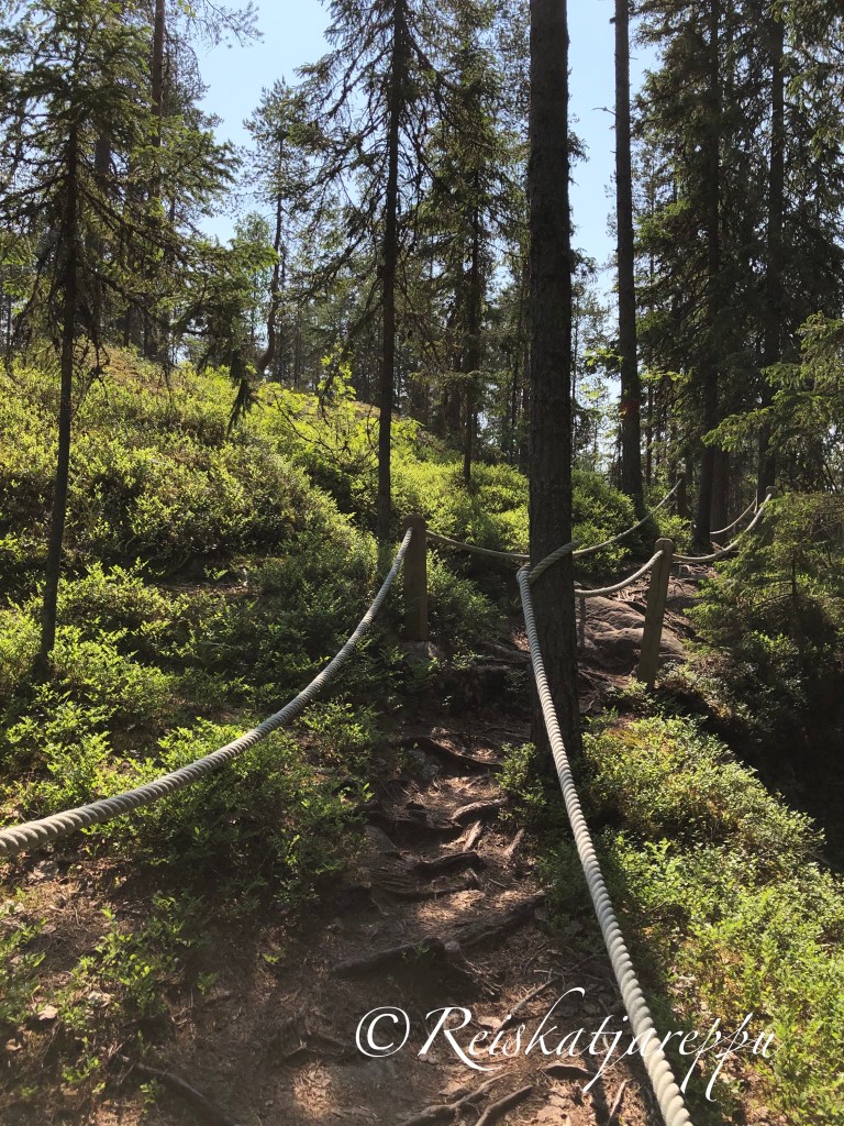 Me kaksi ”vanhaa” jäärää lähdimme polkua pitkin tietenkin just toisinpäin, sillä puuhun oli laitettu lappu kiertosuunnasta. Se ei haitannut meitä kuivalla kelillä liikkuessa. Pitkospuita pitkin metsään ja portaita ylös kallioille. Vau, mitkä näkymät. Rotko avautui edessämme eikä voinut kuin huokailla sen kauneuden ja karuuden edessä.