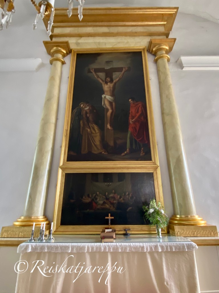 Kaksiosaisen alttaritaulun on maalannut Axel Johan Fägerplan vuonna 1825 Tukholmassa. Ylemmässä taulussa on Jeesus ristiinnaulittuna ja alemmassa Jeesus viimeisellä aterialla. Alttaritaulua reunustavat hienot pilarit ja katos.